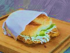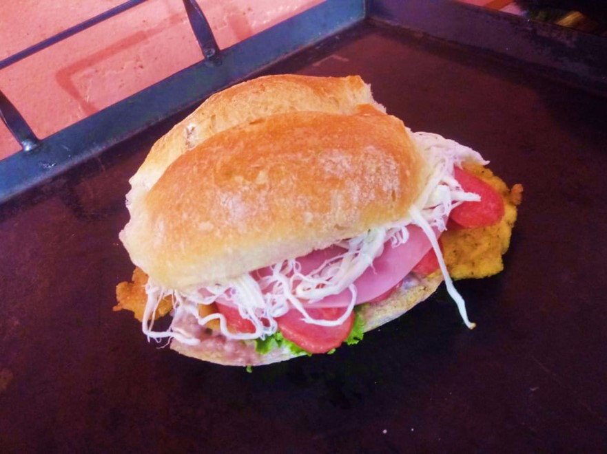 Milanesa de pollo, frijoles, mayonesa, lechuga, quesillo, jamón, queso amarillo, pepino, tocino y pan de linaza.