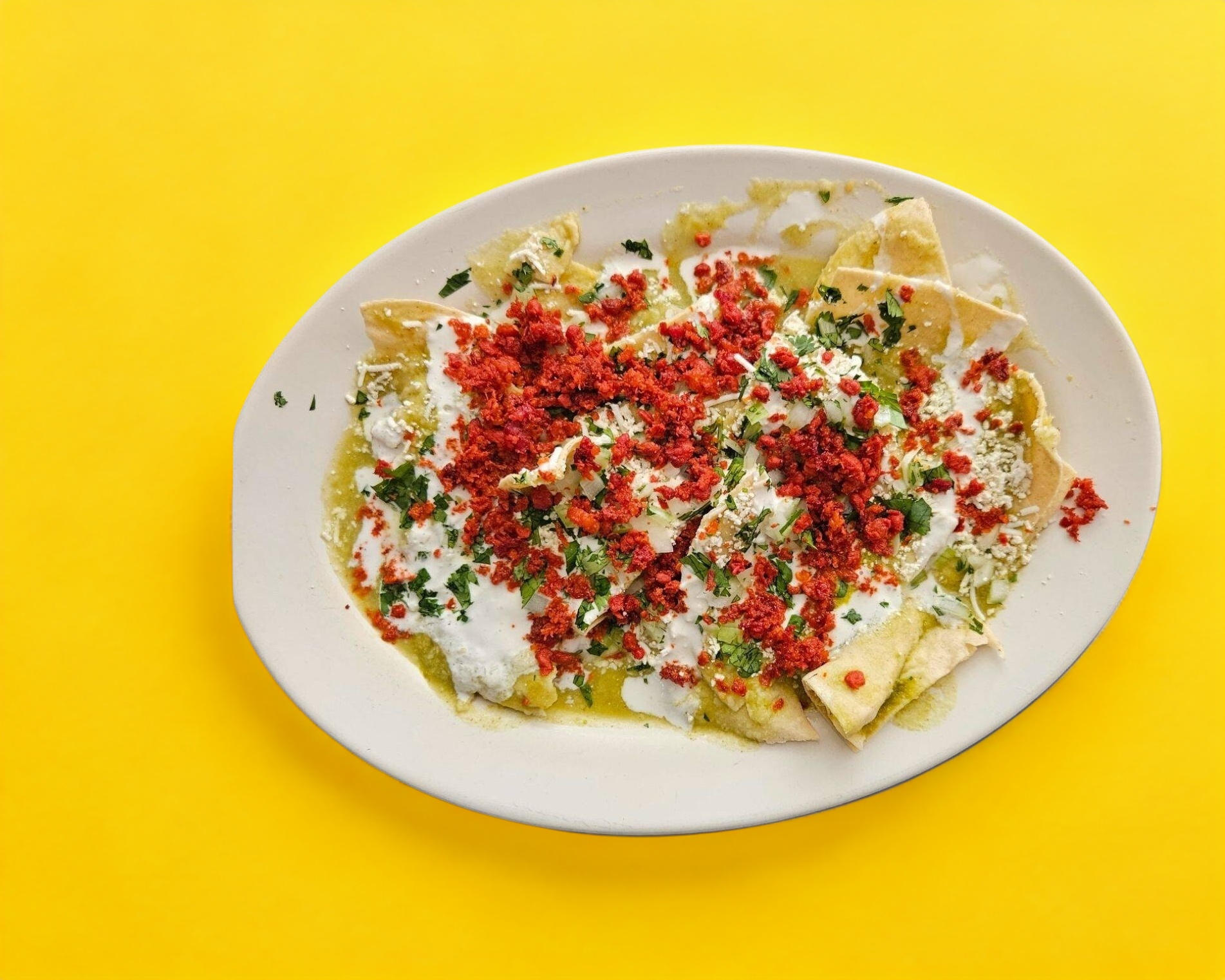 Chilaquiles verdes con crema, queso, cebolla, cilantro y chorizo espanol con chicharron