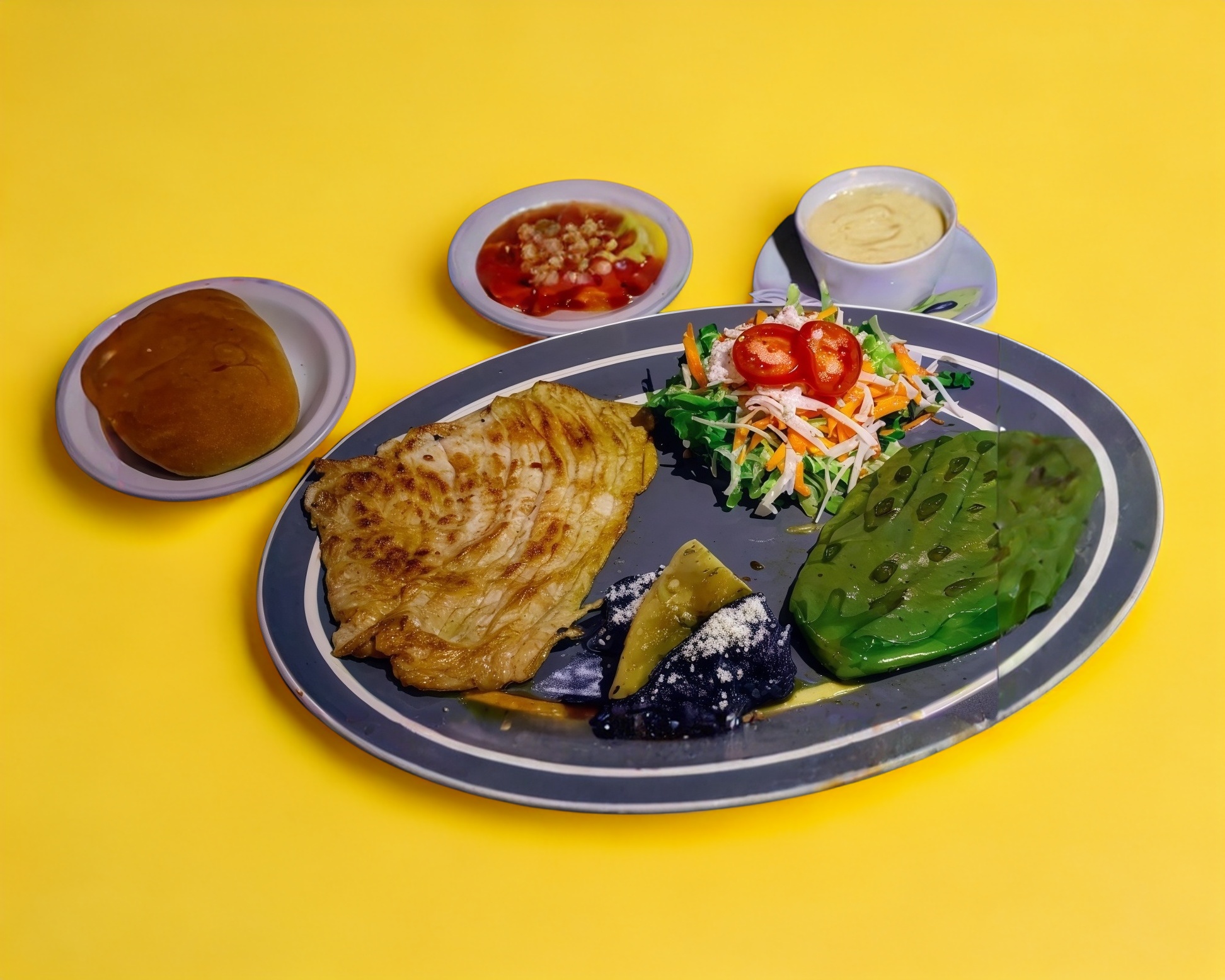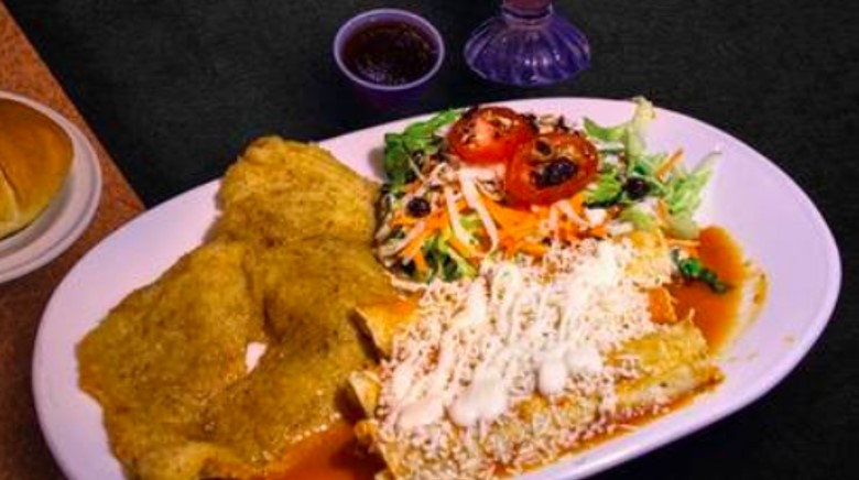 Milanesa de pollo con tres piezas enchiladas rojas con ensalada de la casa