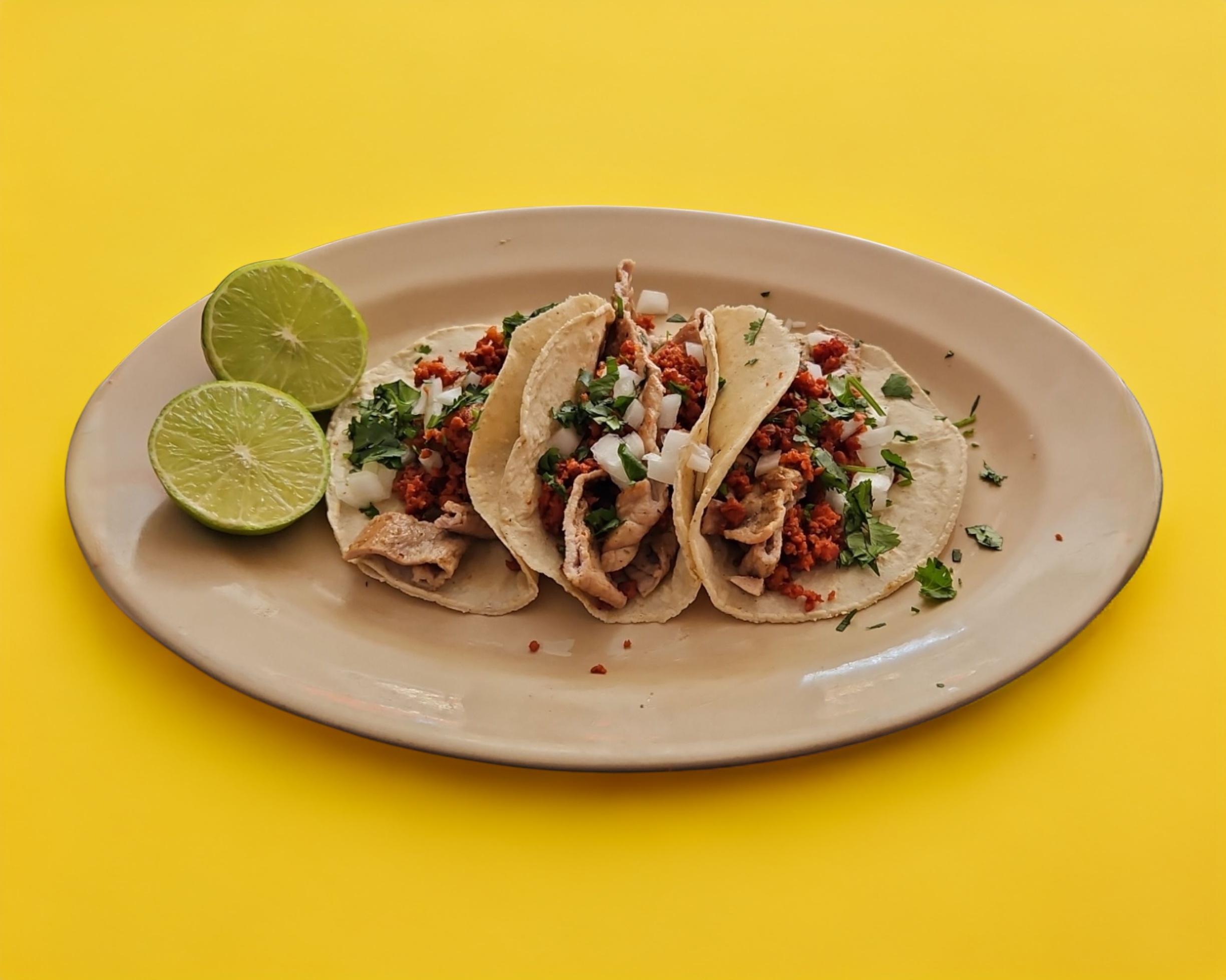 3 Tacos de asada acompanados de cebolla, cilantro y chorizo espanol . Incluye: Agua y postre