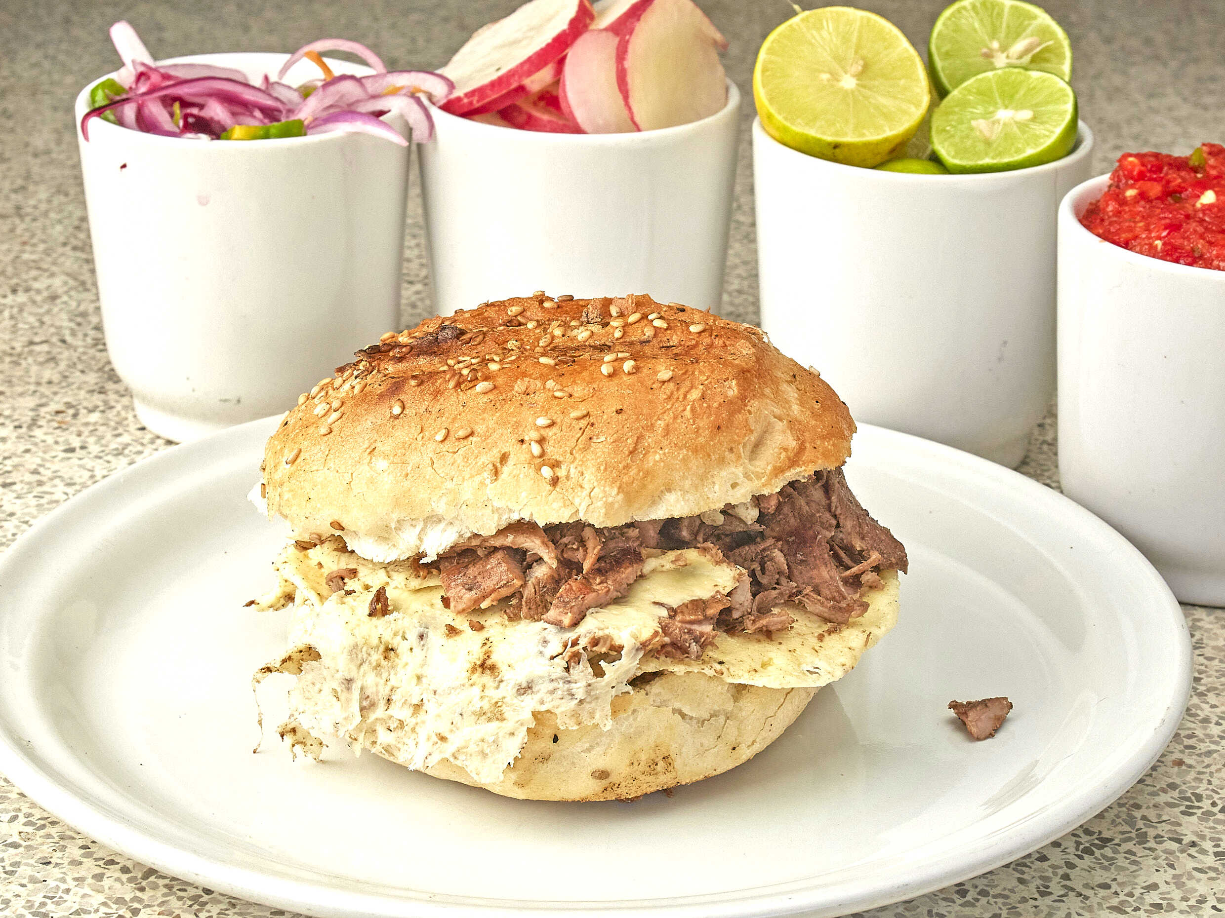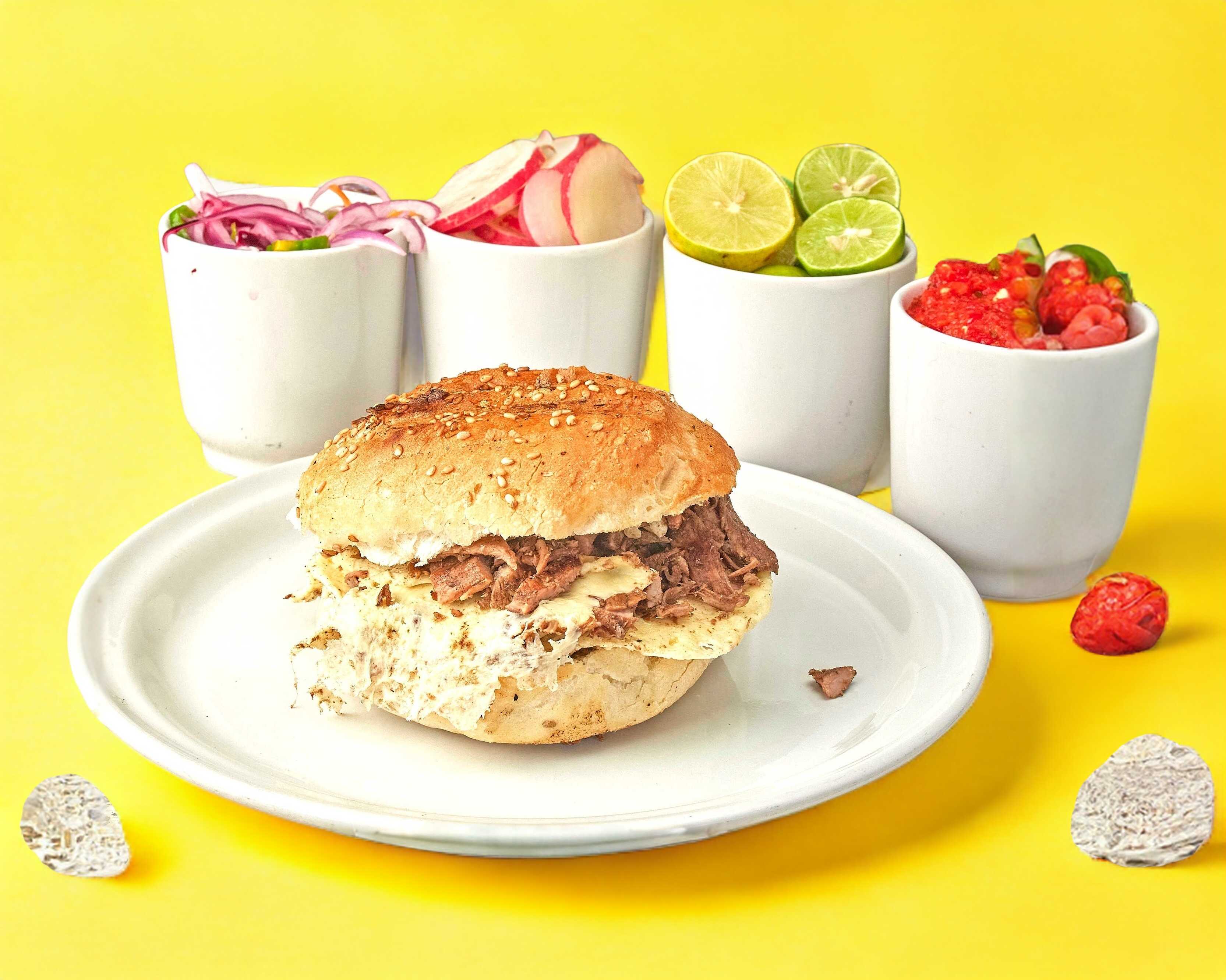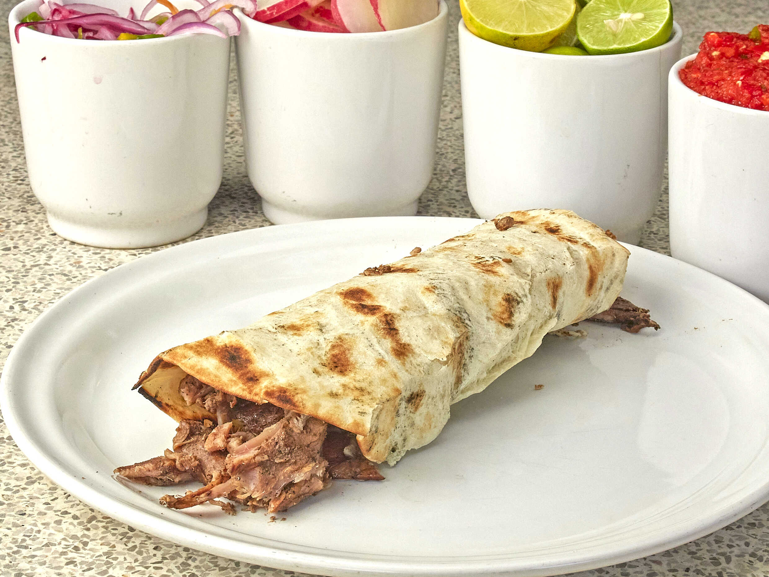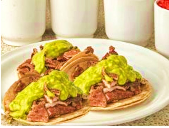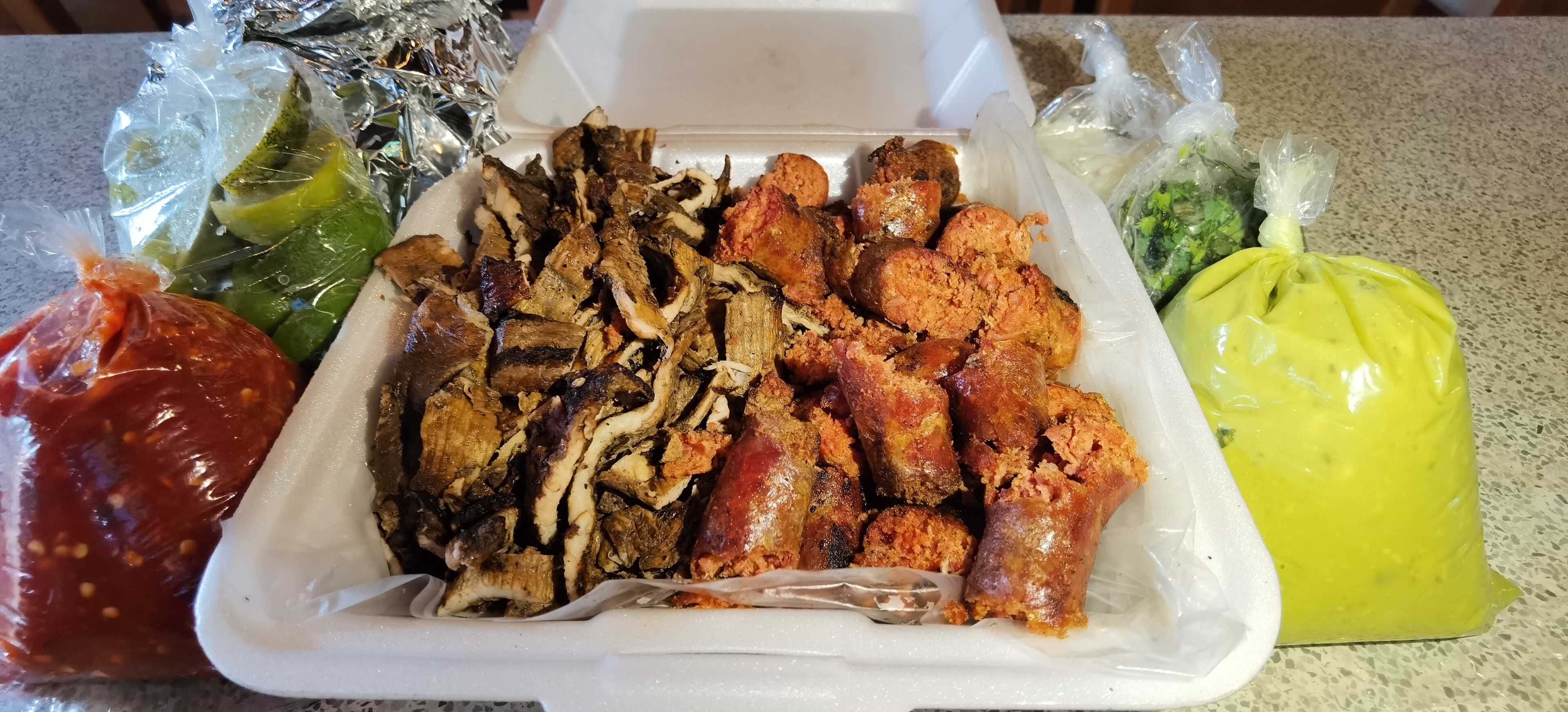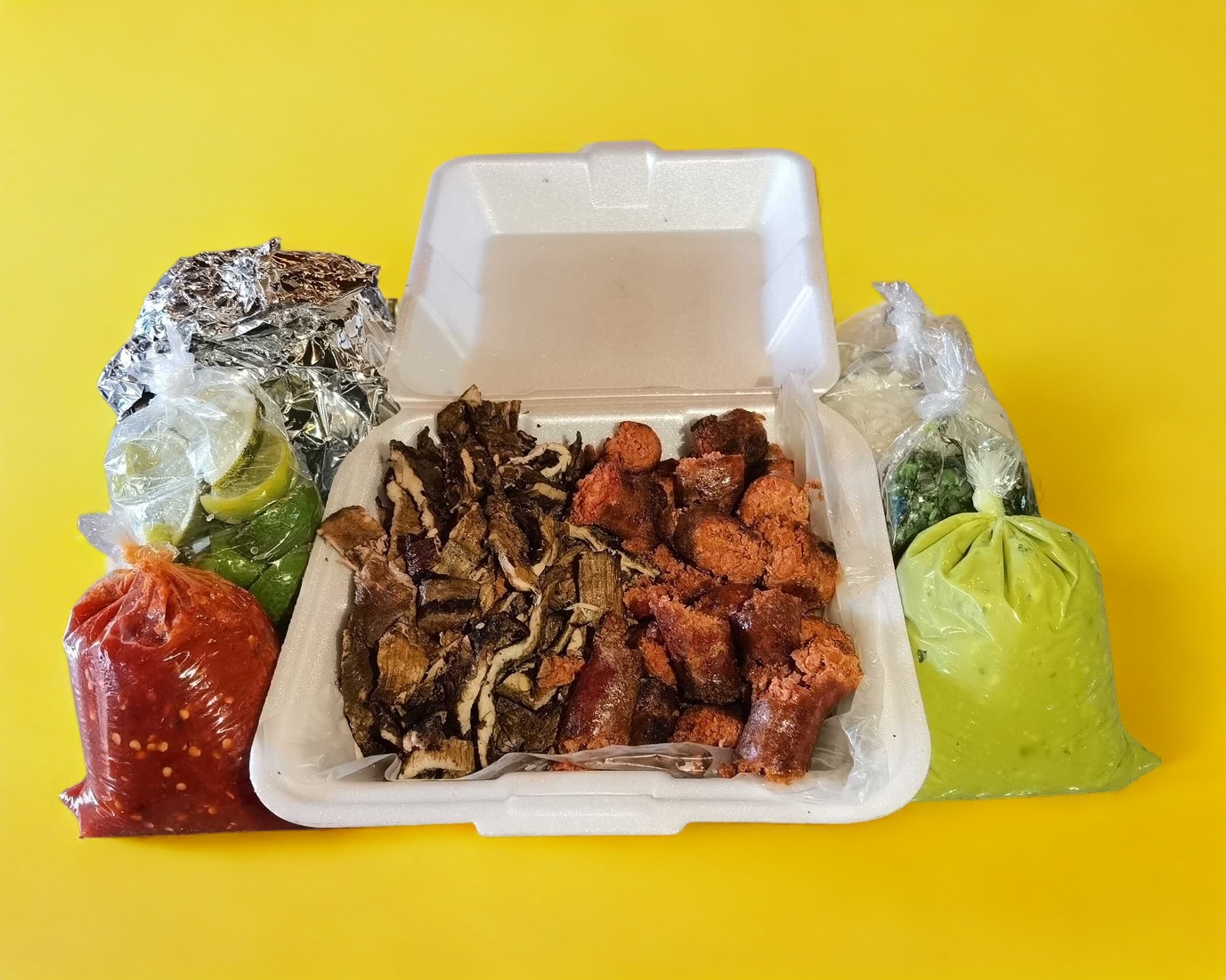 Complementos 1 kilo de carne, 2 cemitas, 20 tortillas de maíz, 4 tortillas de harina, limones, salsa, cilantro, cebolla y guacamole.