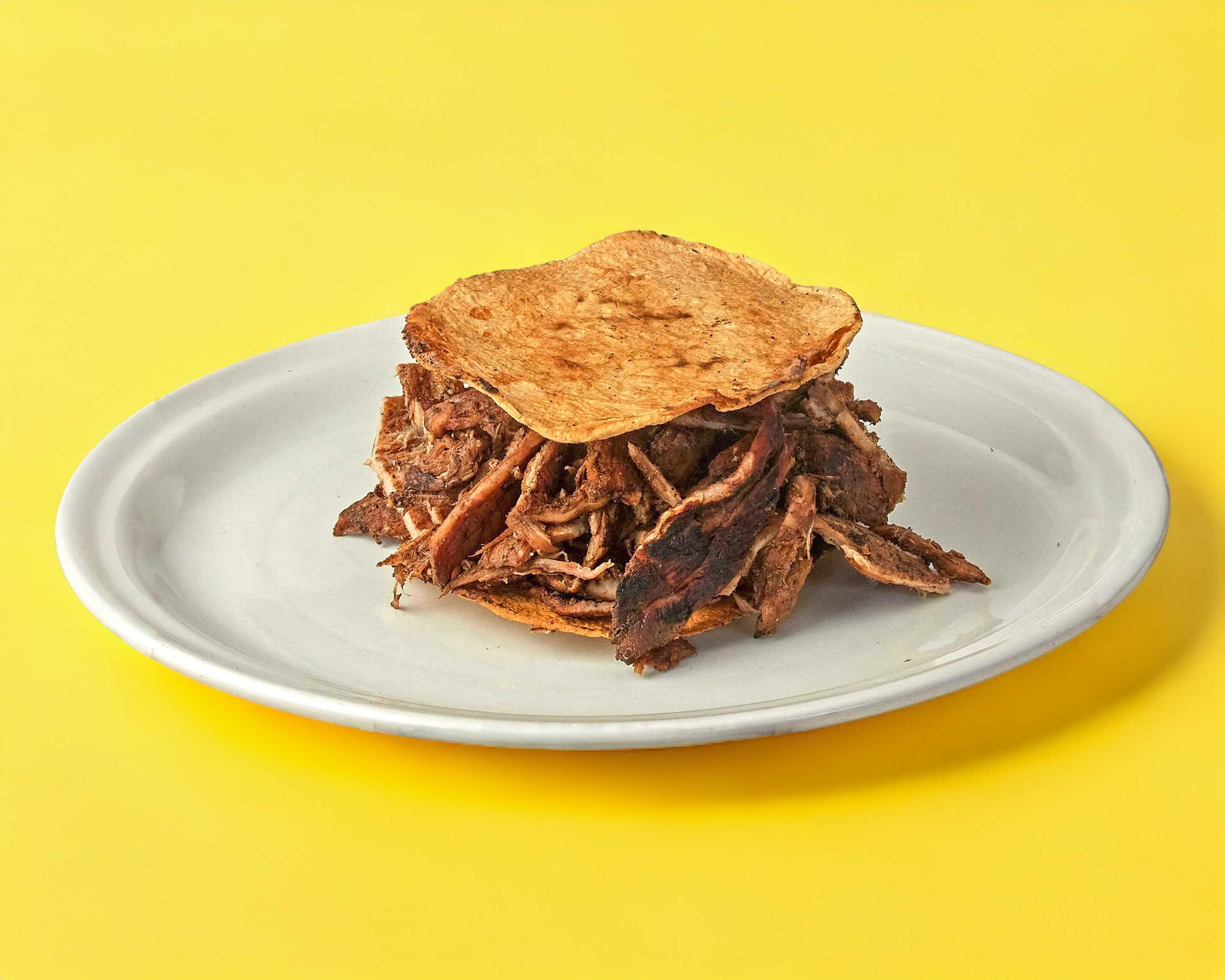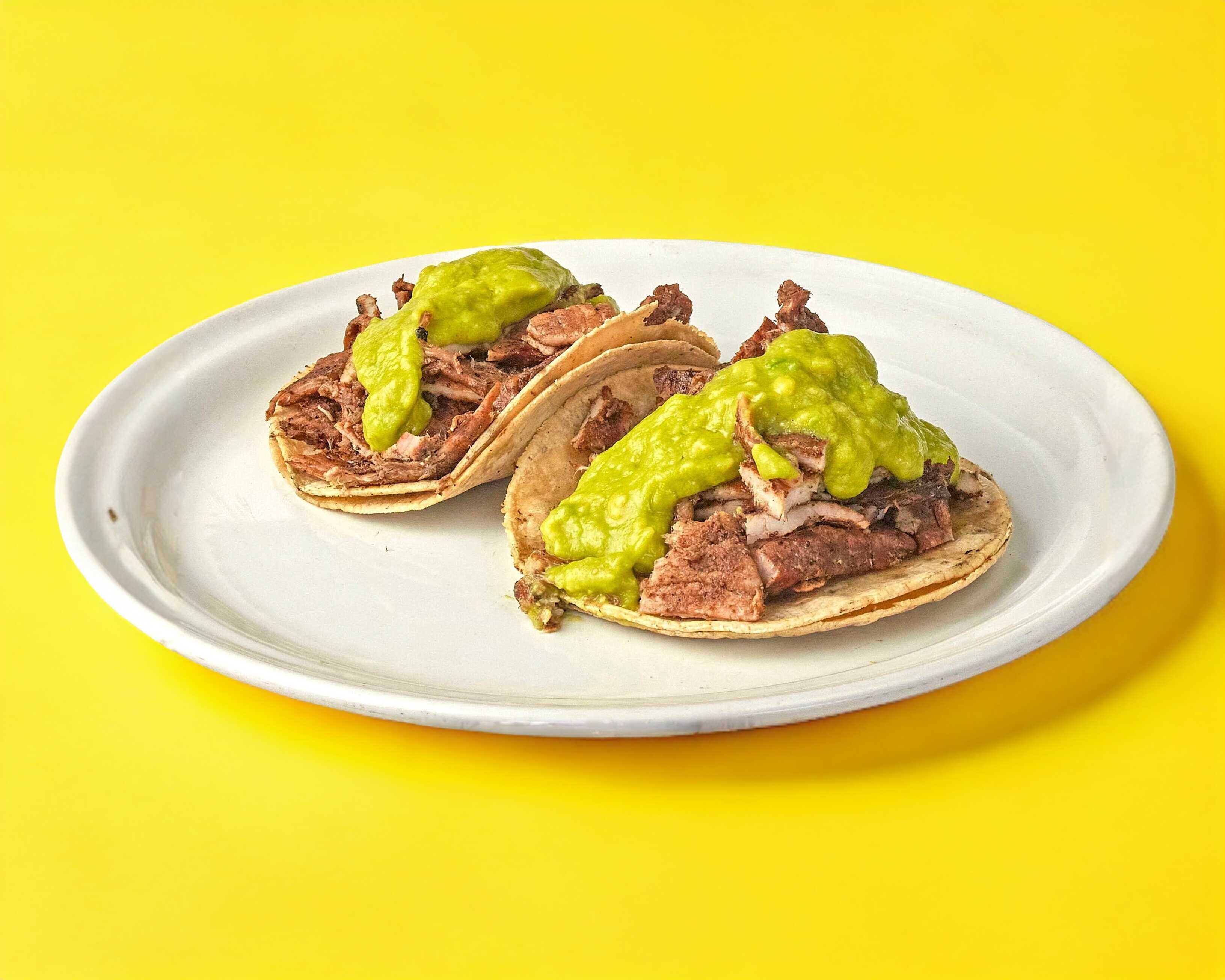 1 Taco de doble tortilla de maíz con carne a elección (Salsa y verduras (cebolla blanca, cilantro, rábano y cebolla morada) aparte)