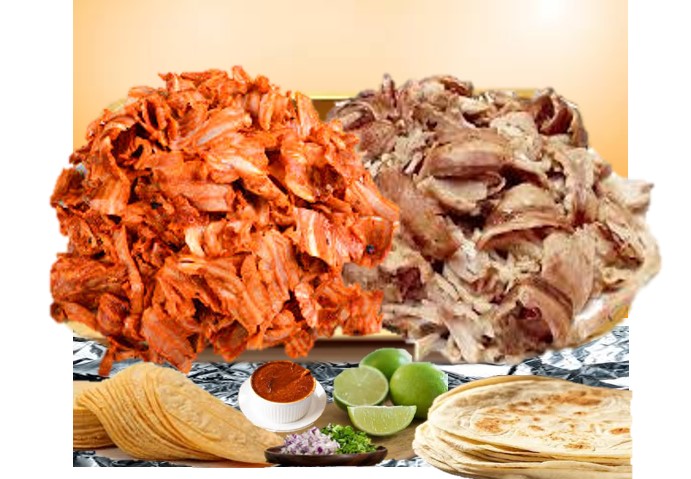 Porción para compartir: 1/4 Kg de Carne Pastor, 1/4 Kg de Carne Árabe, Incluye 5 piezas de pan árabe, 5 piezas de tortilla de maíz, salsa de la casa, salsa roja, salsa verde y limones.