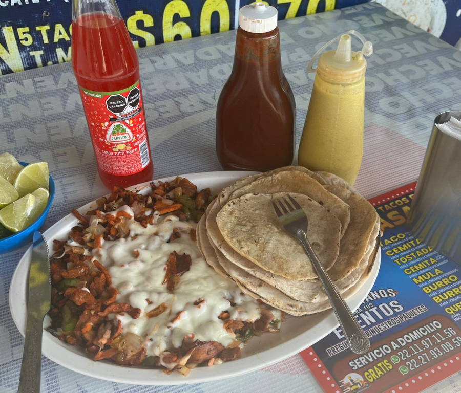 Doble tortilla de harina, Carne Pastor, Cilantro, Piña, salsa italiana, doble queso, salsa y limón