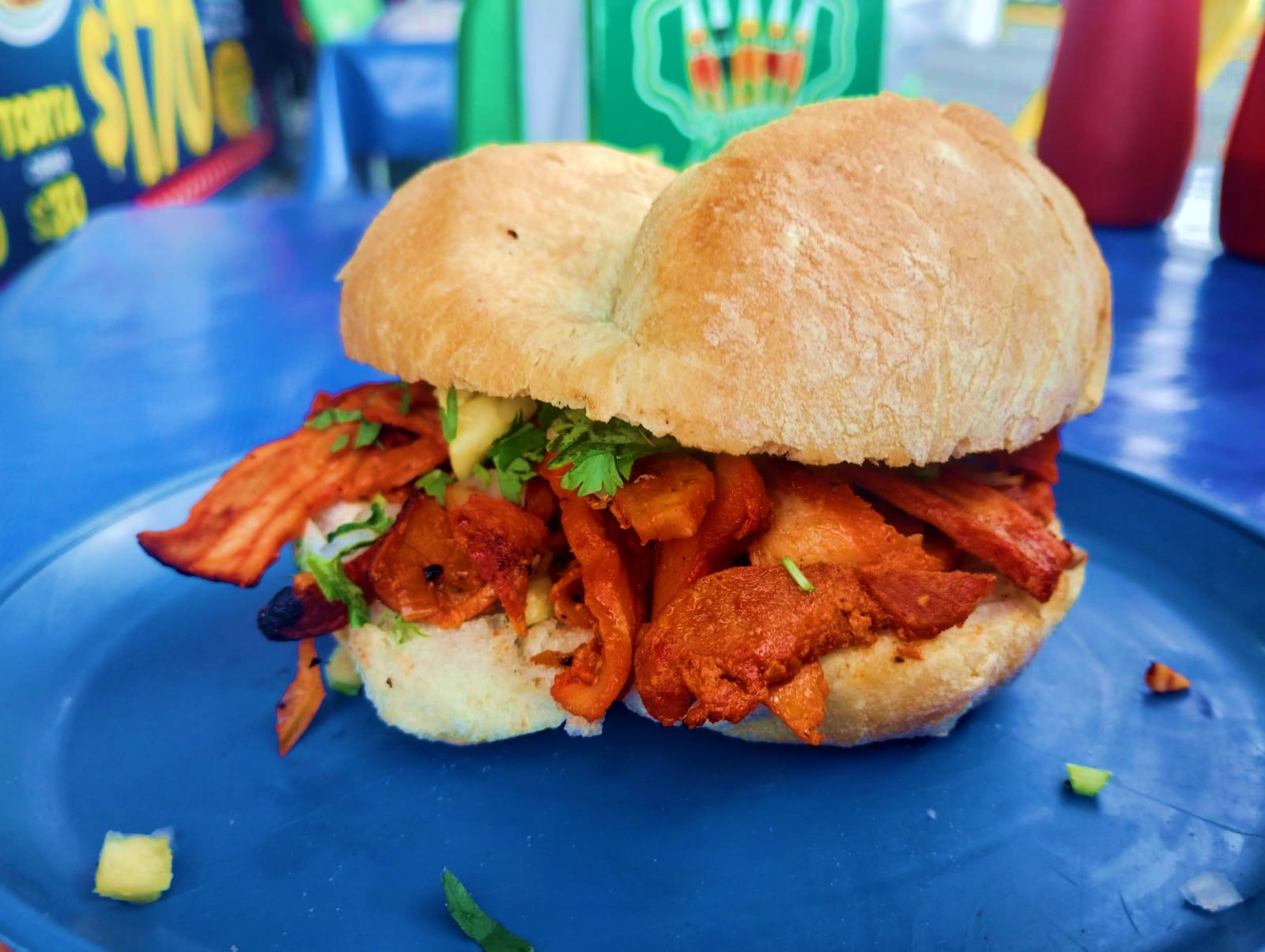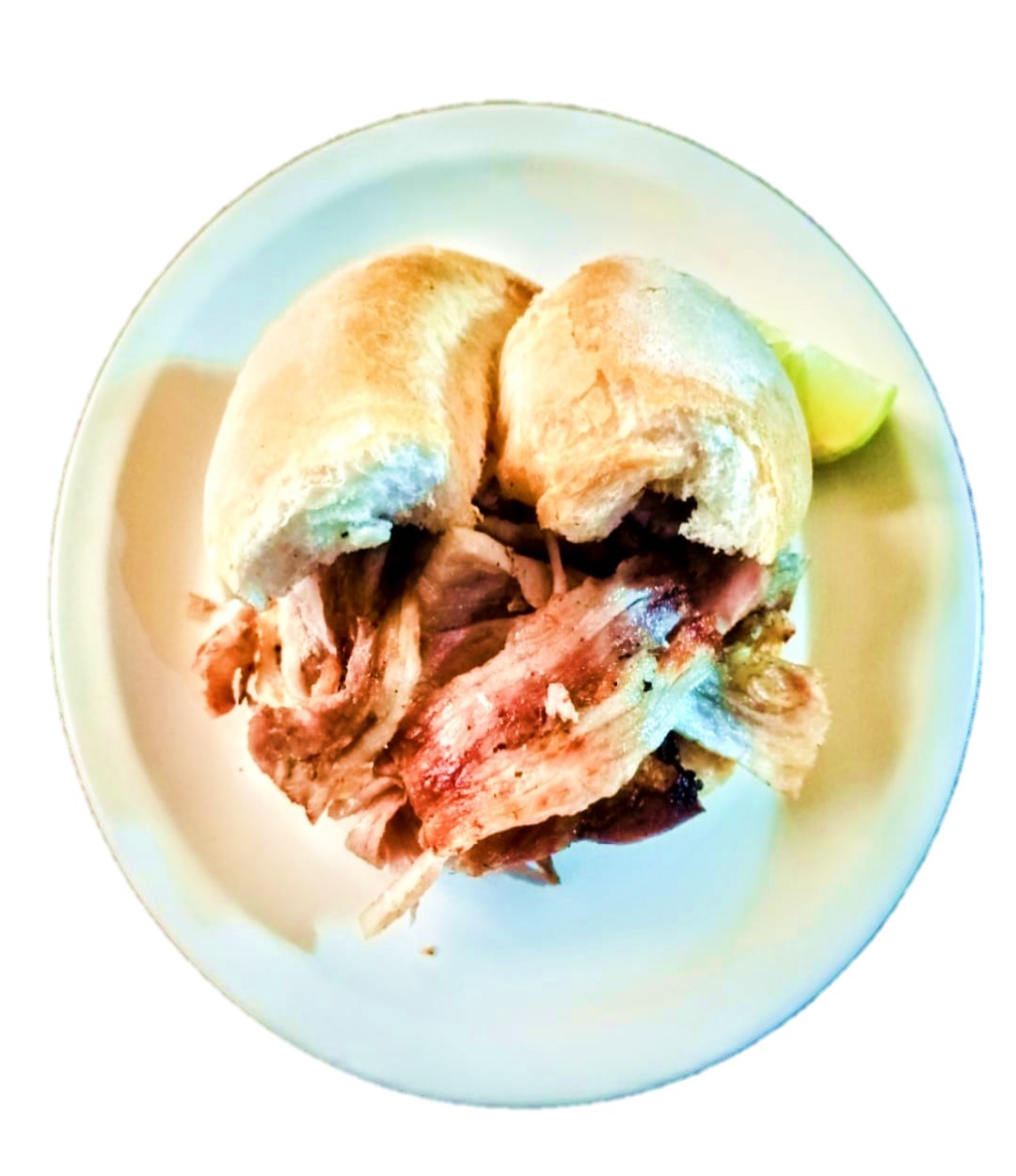 Pan de Cemita, carne pastor, cebolla, salsa roja o verde, limones