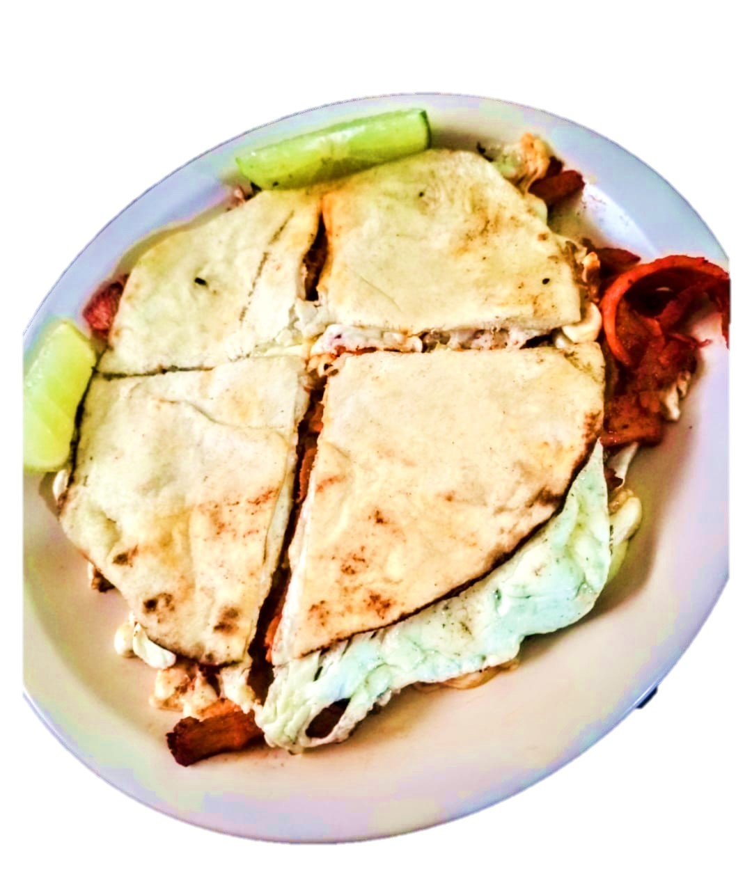 Doble tortilla de harina, Carne Pastor y Carne Árabe, Cilantro, Piña, salsa italiana, doble queso, salsa y limón