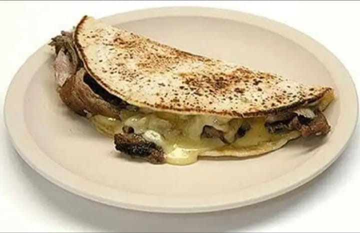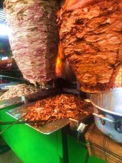 Doble tortilla de pan árabe, carne al pastor y carne árabe, queso, cilantro, cebolla, y piña.