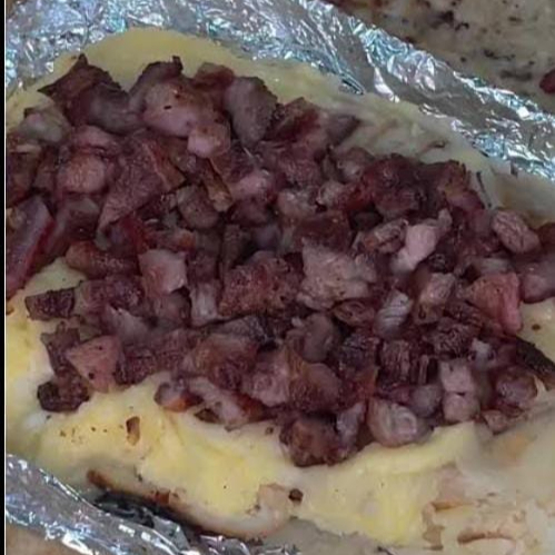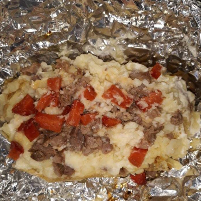 PAPA AZADA CON CHISTORRA CARNE AZADA ARRACHERA CREMA QUESO