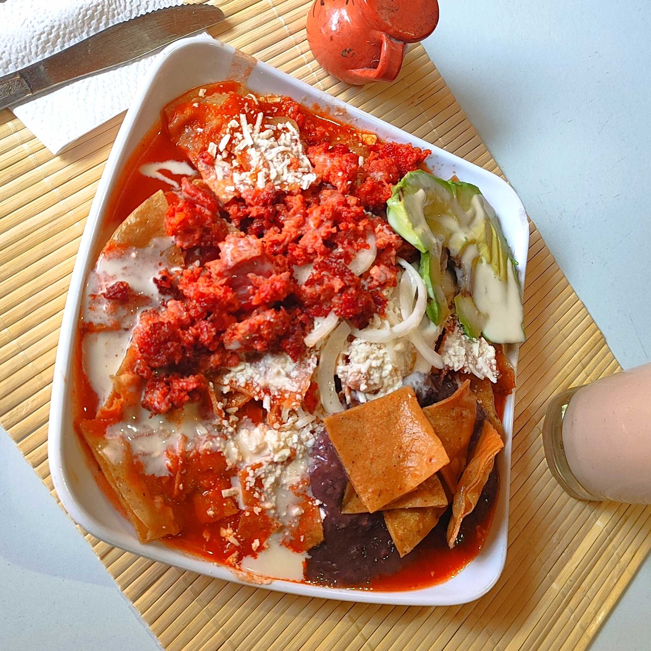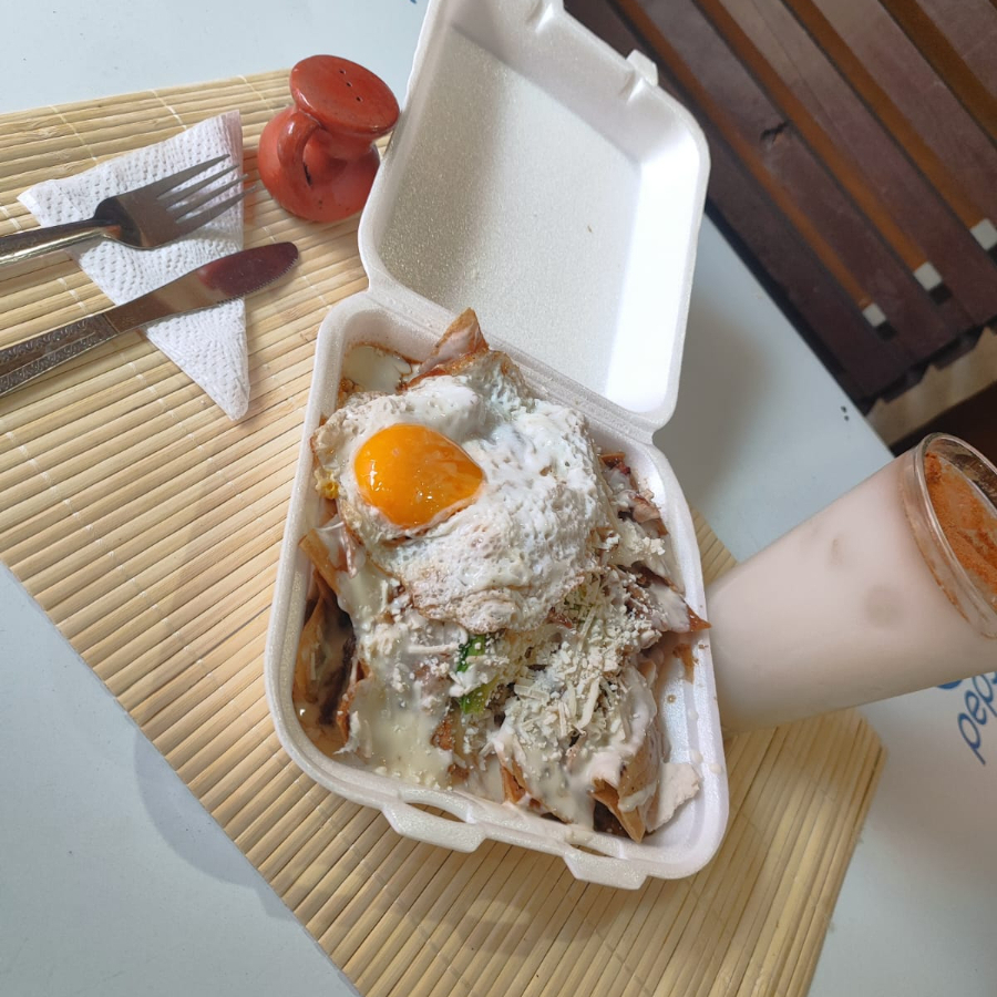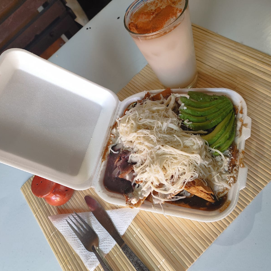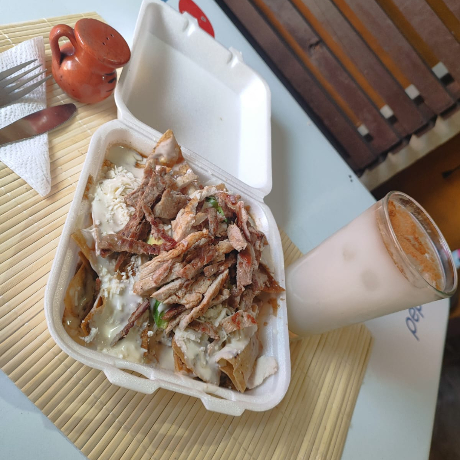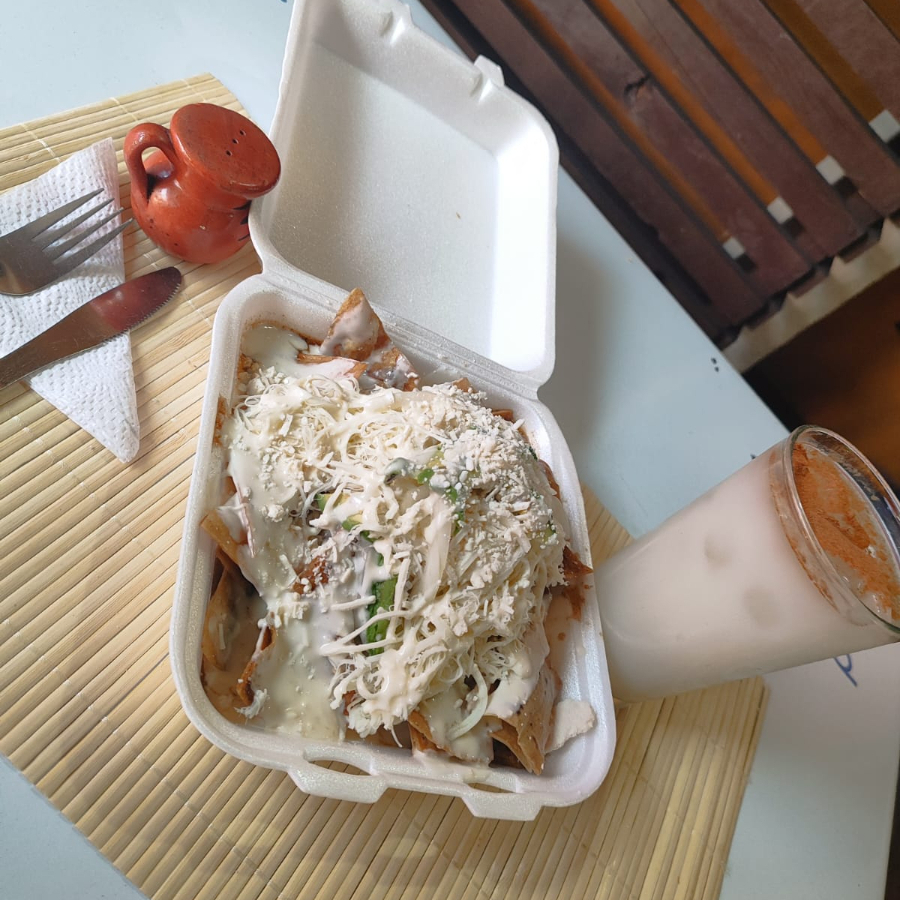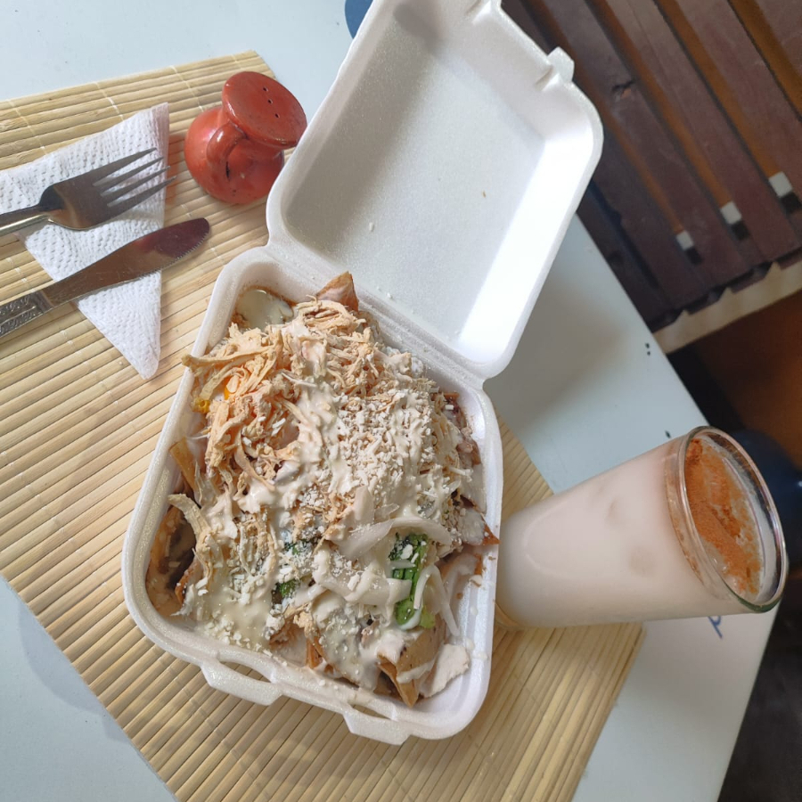 chilaquiles con salsa de chipotle acompañado de crema ,queso y cebolla con su respectiva torta de agua
