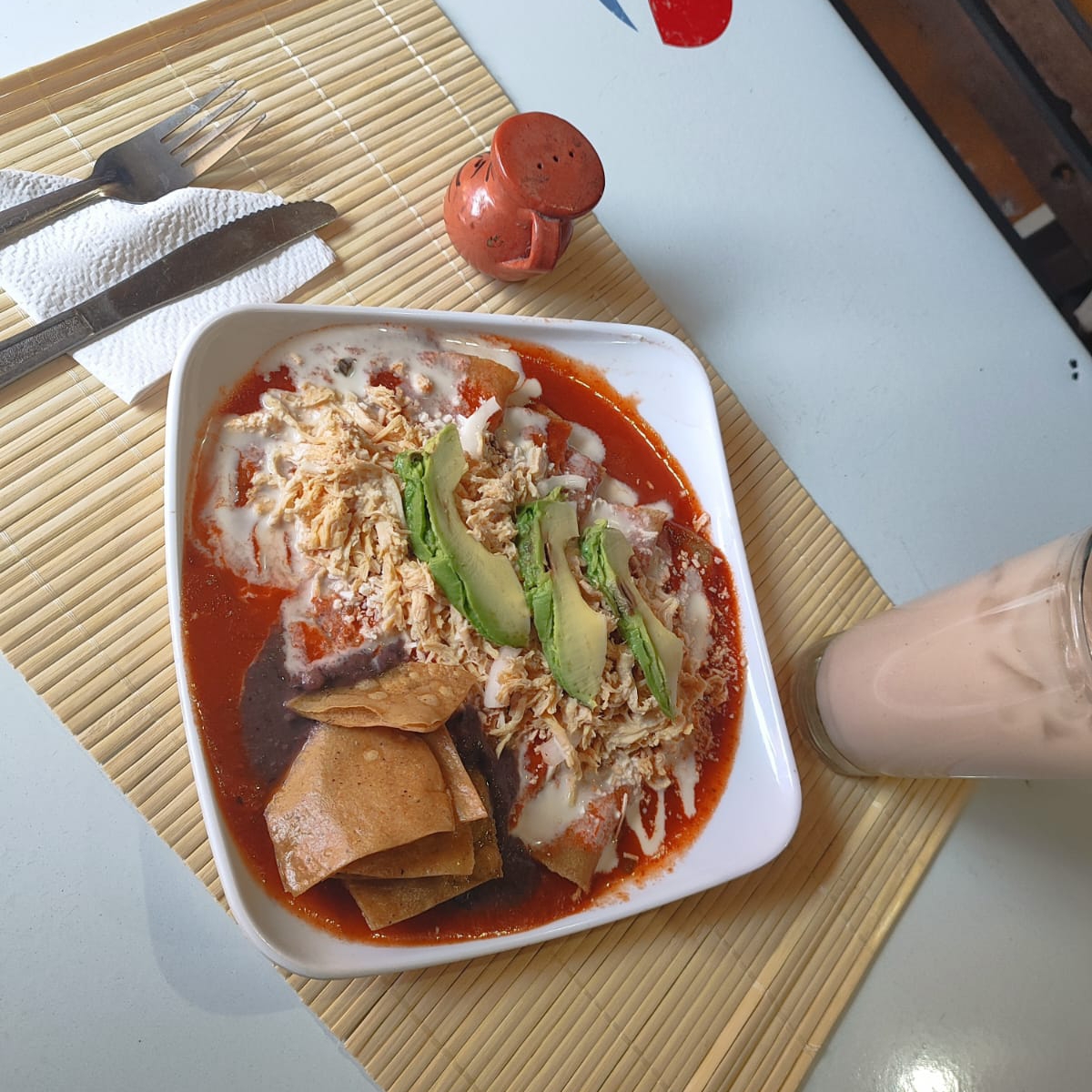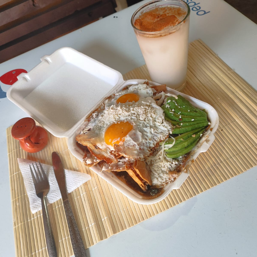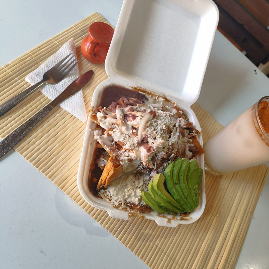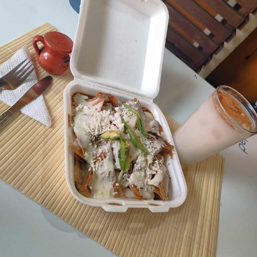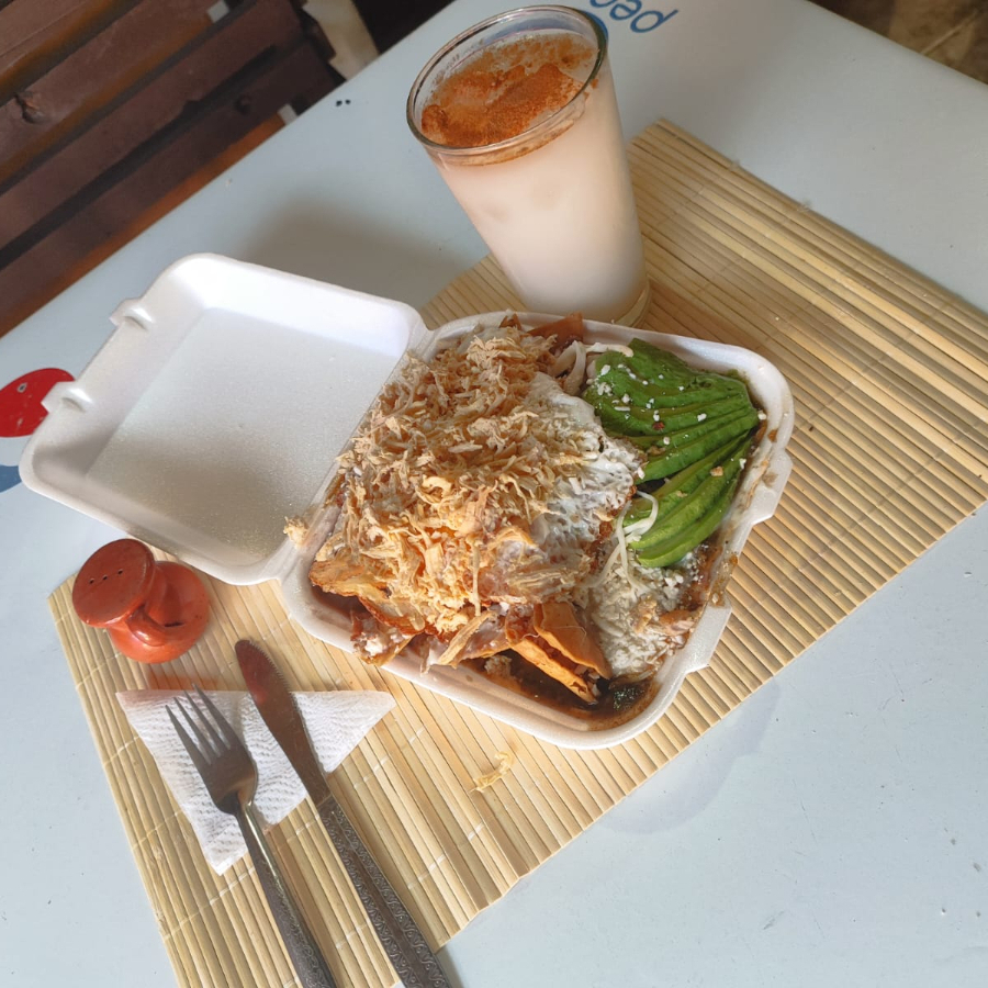 chilaquiles con salsa de chipotle acompañado de crema ,queso y cebolla con su respectiva torta de agua