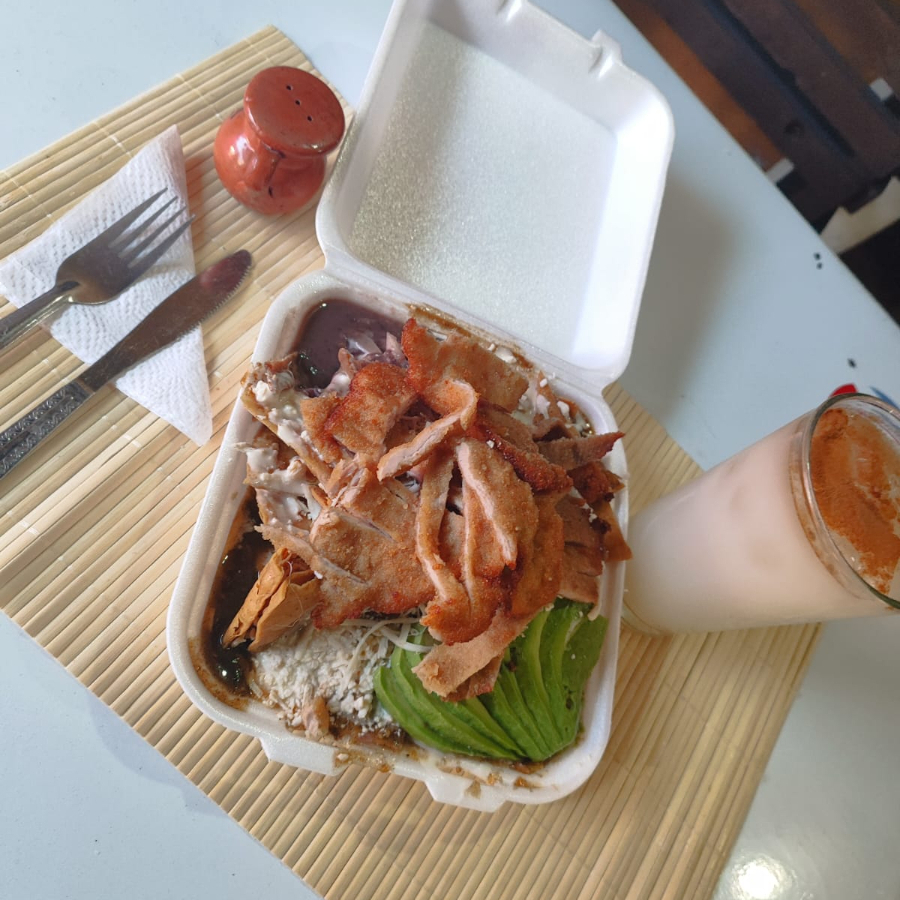 porcion mas grande con queso,crema,cebolla,aguacate frijoles refritos proteina doble y su torta de agua