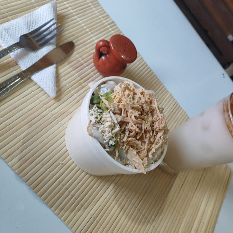 porcion abundante con queso,crema,cebolla,pollo y su respectiva torta de agua