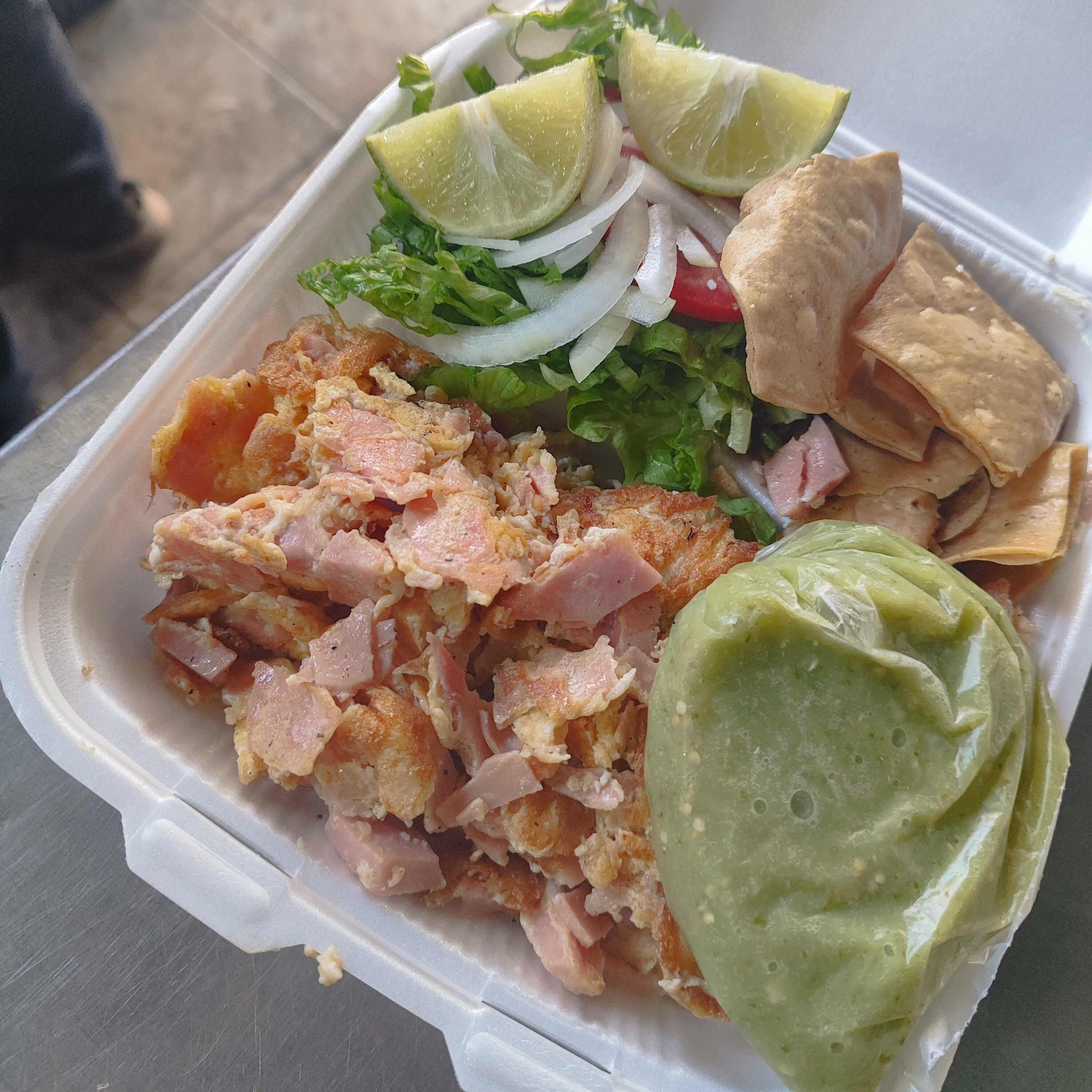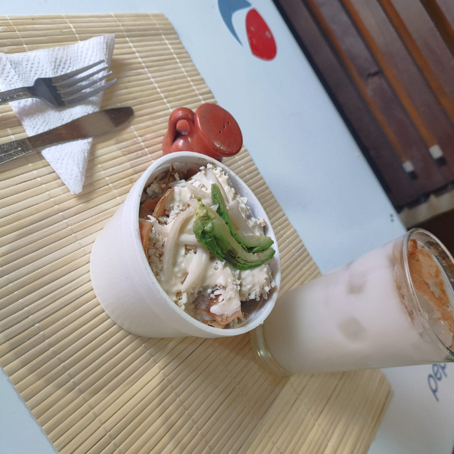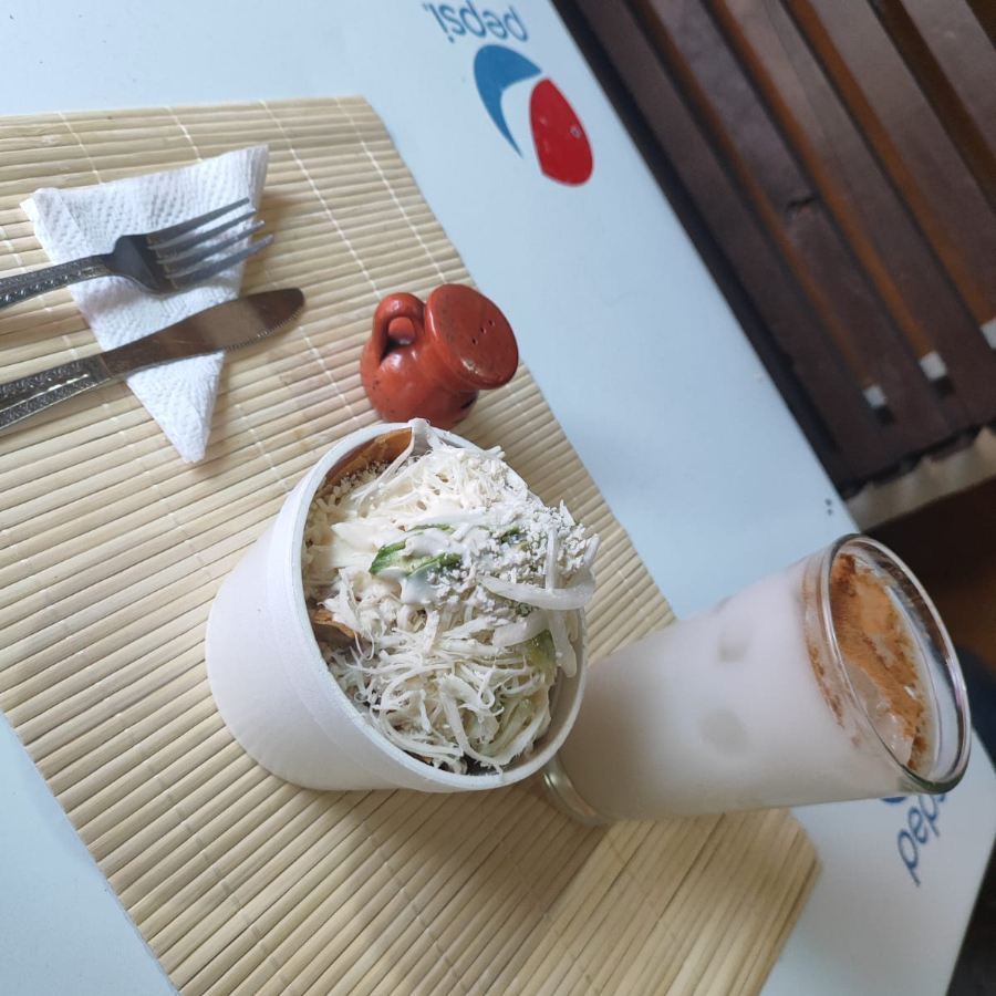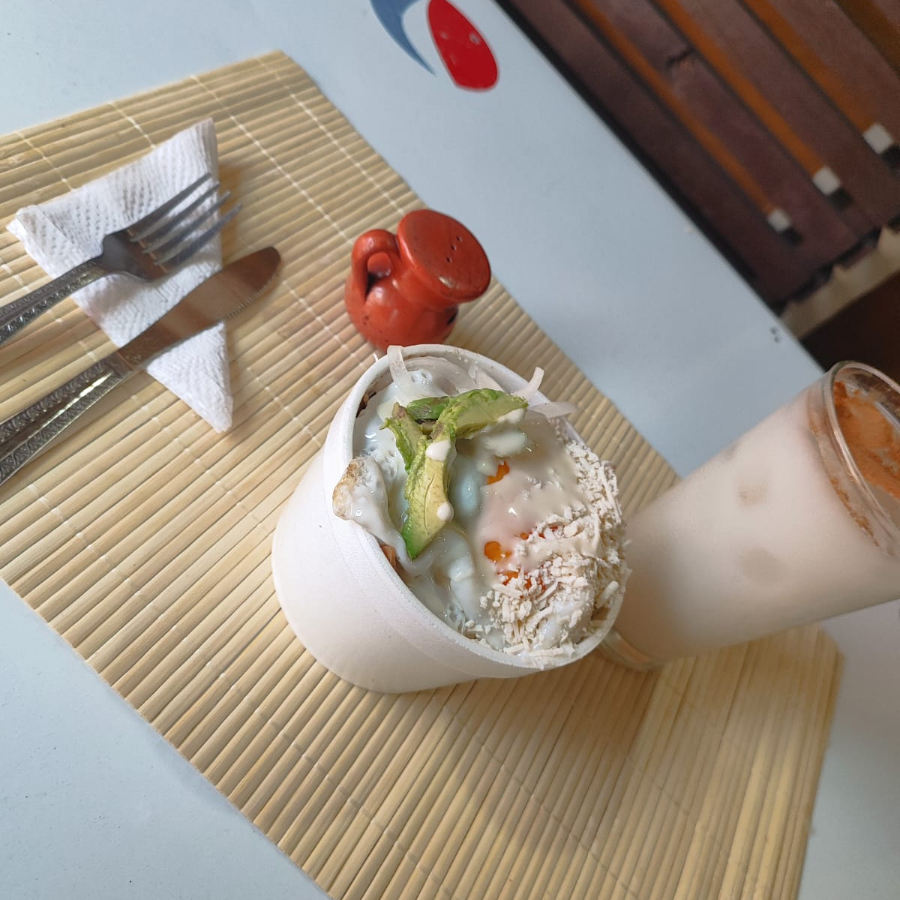 salsa verde a base de tampico con queso ,crema,cebolla,huevo estrellado y su torta de agua