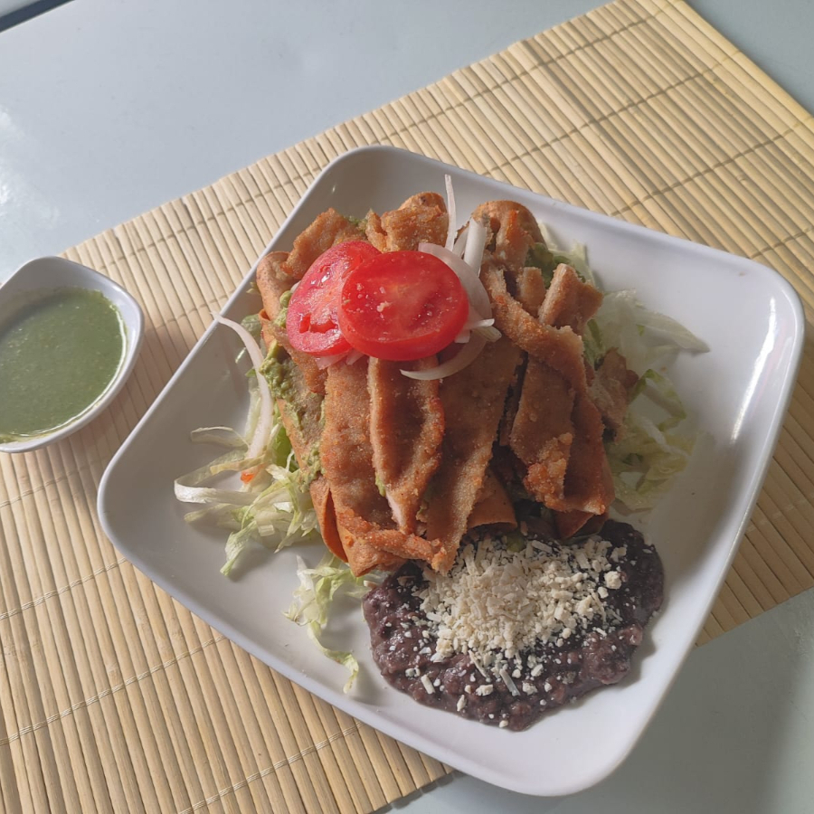 deliciosas flautas con pollo acompañada de lechuga ,guacamole,frijoles refritos ,queso ,crema ,cebolla y salsa a elegir coronado con una milanesa en tiras
