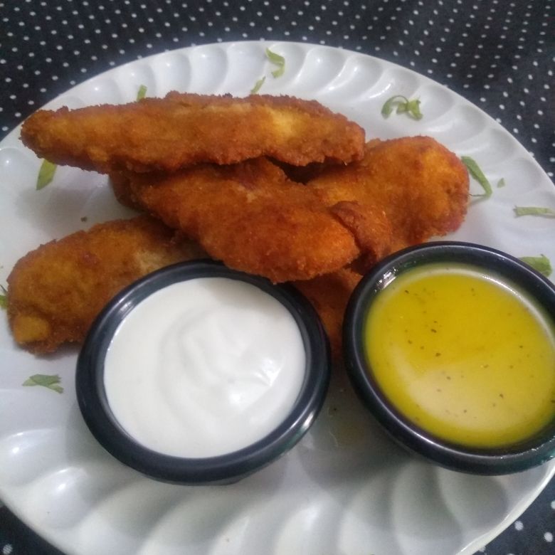 5 tiras de pollo empanisadas fritas con aderezo ranch o aderezo honey mustard