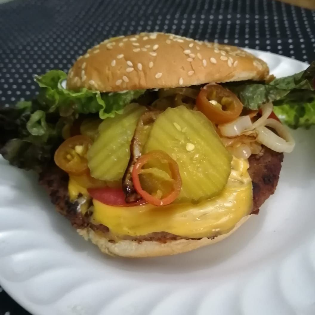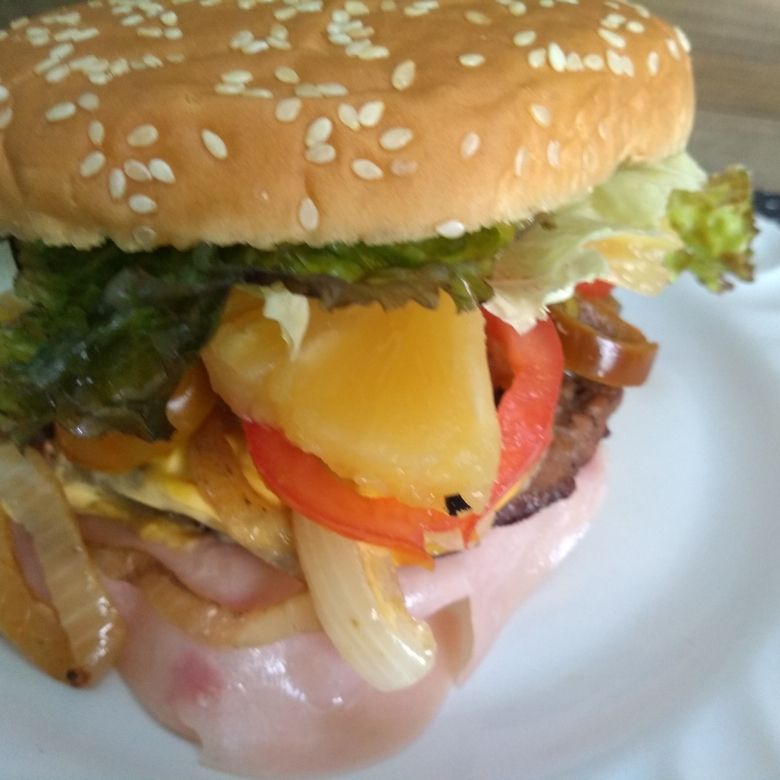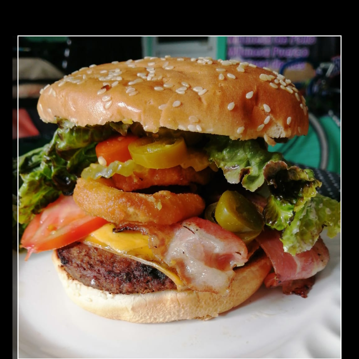 Carne de Res tipo Arrachera 150 gr, acompañada de mayonesa, queso americano, queso cheddar, tiras de tocino, aros de cebolla, lechuga, jitomate, pepinillos y chile jalapeño