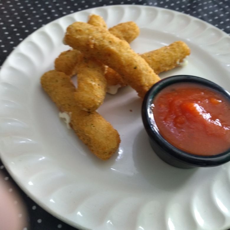 orden de 5 dedos de queso mozzarella empanisados frtas y como complemeto salsa marinara hecha a base de tomate rojo