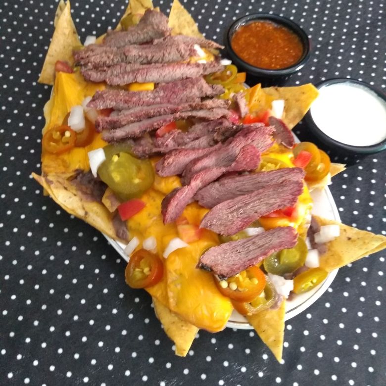 chips de tortilla frita, 150 grs. de carne arrachera , frijoles refritos, mezcla de quesos cheddar y gouda fresco derretido, jalapeños, cebolla, jitomate, y crema crema