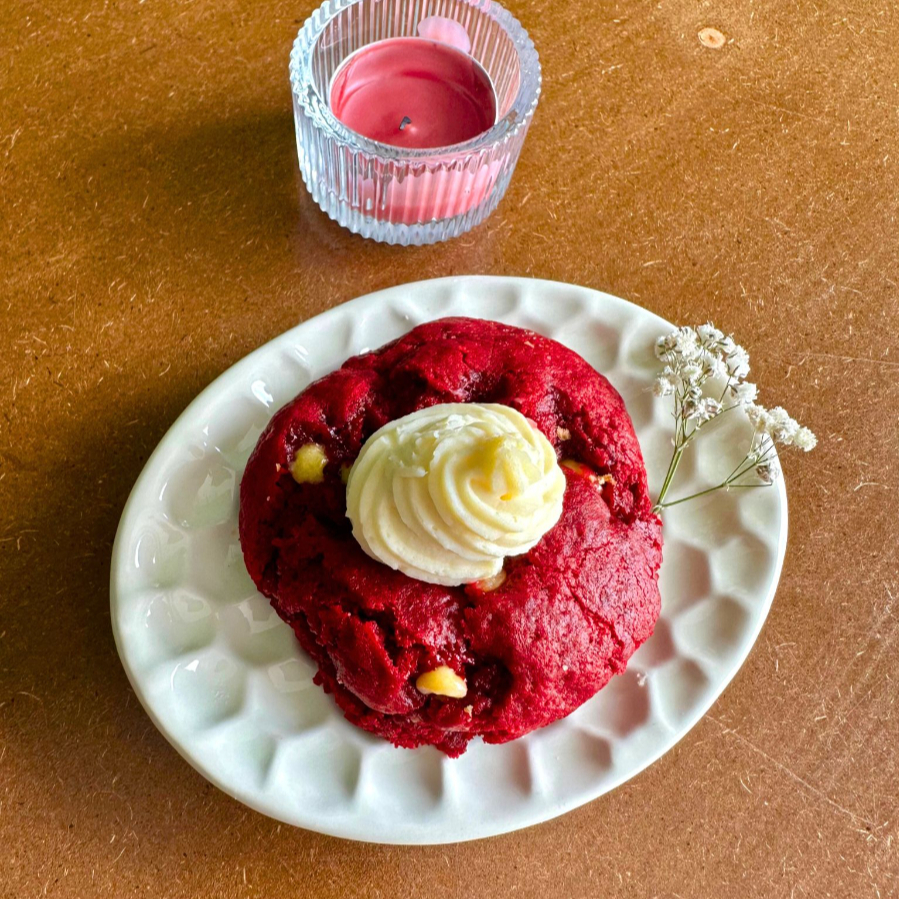 Galleta estilo Nueva York de Red Velvet, decorada con un frosting dulce de queso crema. Esponjosa, elegante y con un contraste irresistible entre lo suave y lo cremoso.