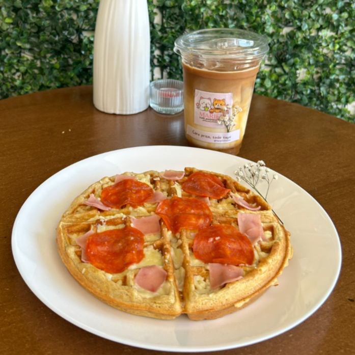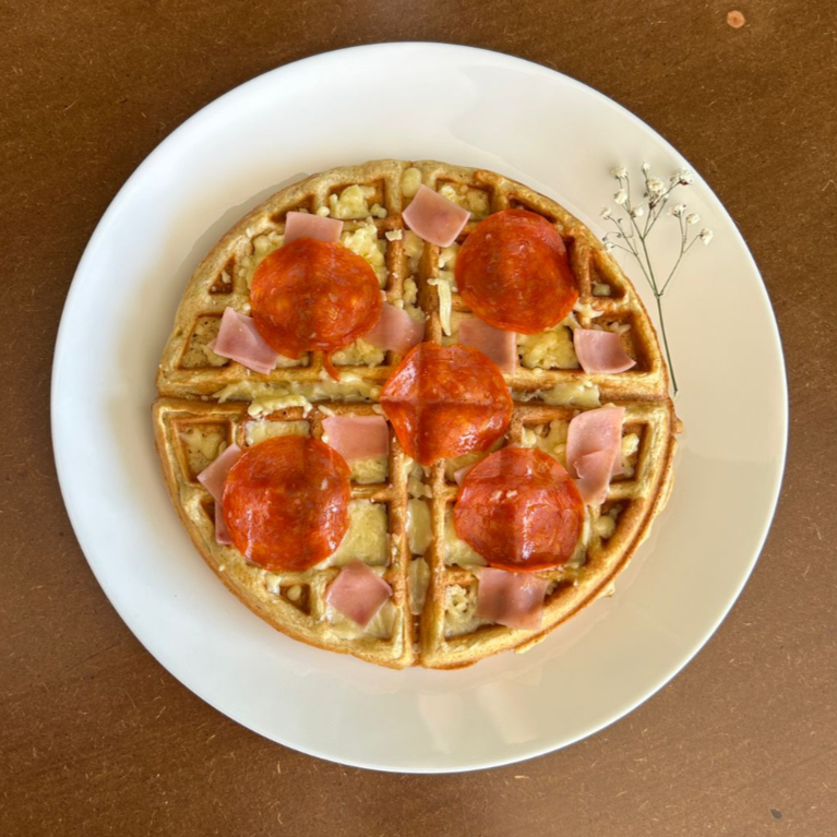 Waffle salado con queso derretido, jamón y peperoni. Crujiente por fuera, suave por dentro y con un toque irresistible de sabor casero.