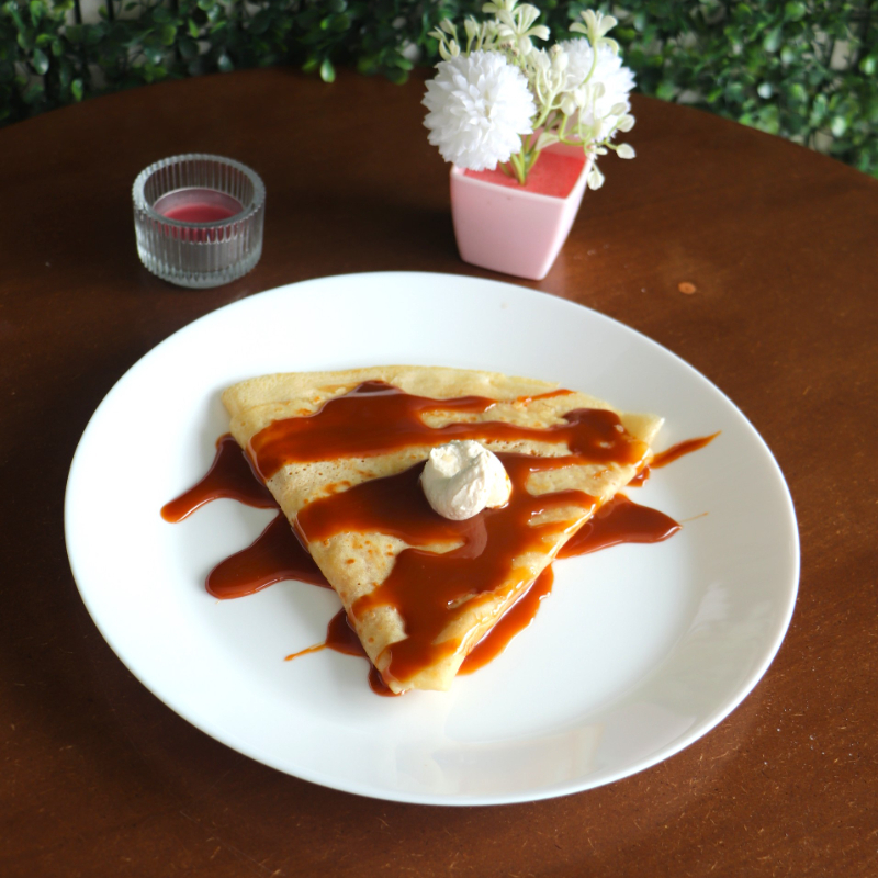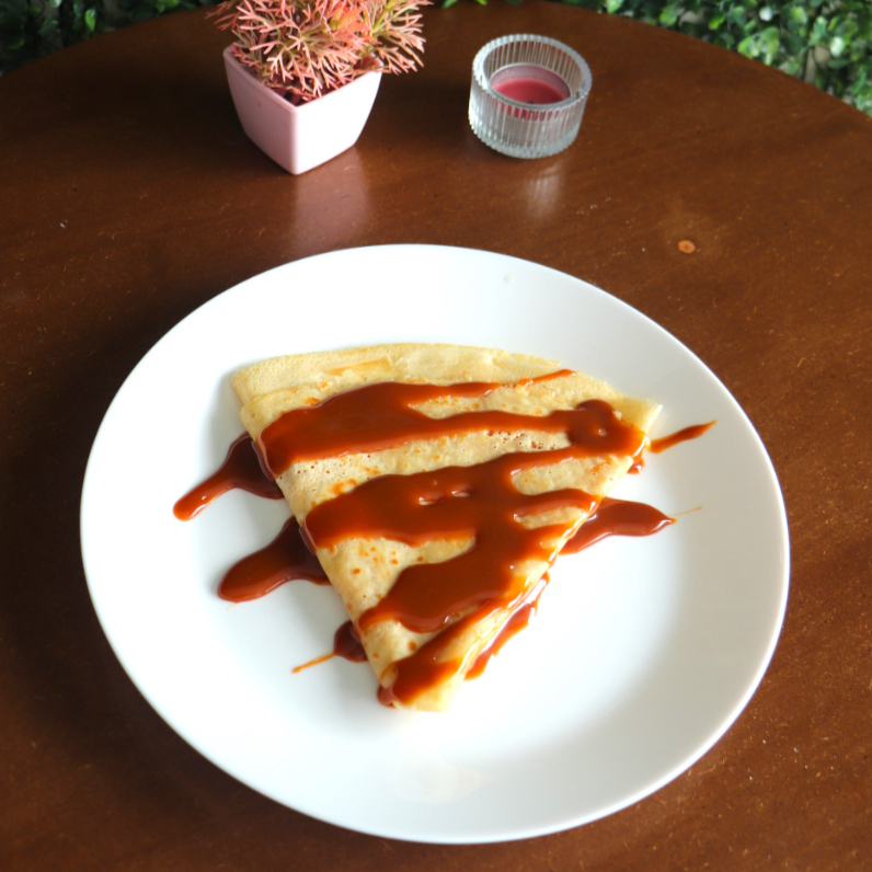 Crepa rellena de cajeta tradicional, suave y acaramelada. Dulce y con sabor mexicano.