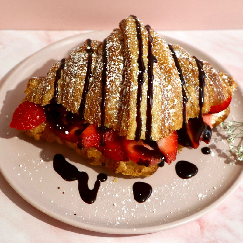 Croissant suave y hojaldrado relleno de NUTELLA y fresas frescas. Un equilibrio perfecto entre acidez, dulzura y cremosidad.