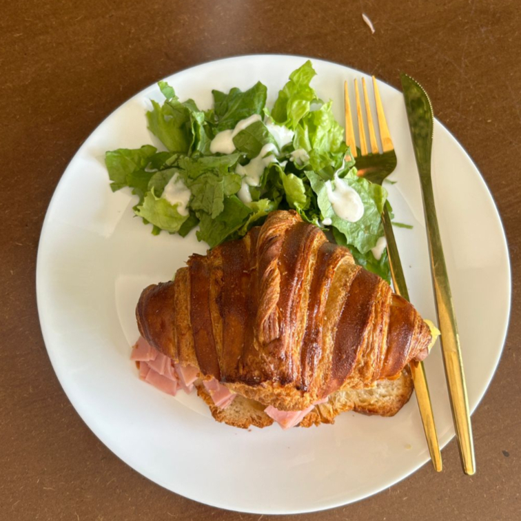 Croissant horneado con jamón, peperoni, queso derretido y acompañado de lechuga fresca. Crujiente por fuera y lleno de sabor por dentro.