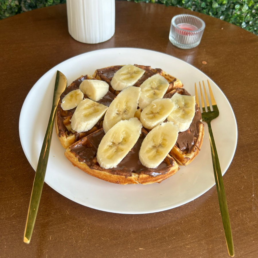 Waffle de masa vainilla con Nutella y rodajas de plátano. Suave, cremoso y delicioso en cada bocado.