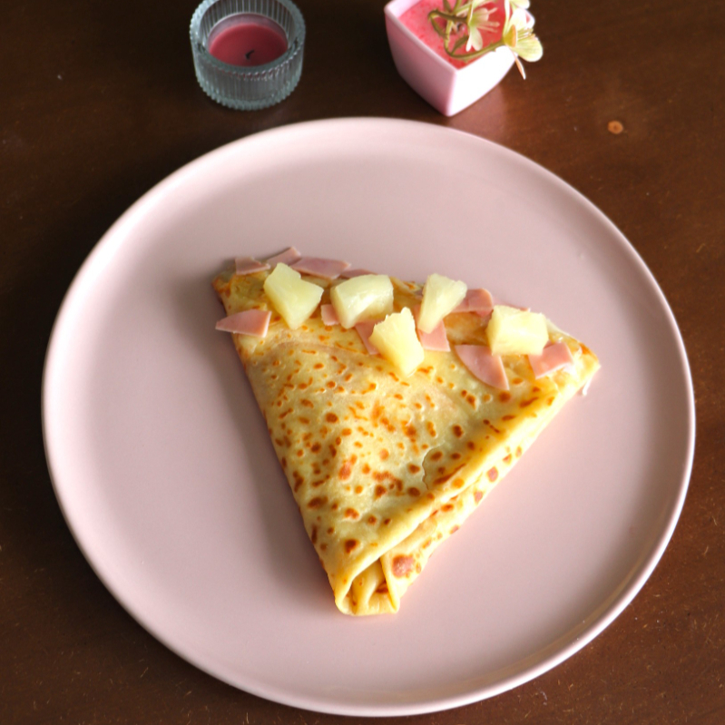 Crepa rellena de queso fundido, jamón y piña. Una combinación salada-dulce irresistible.