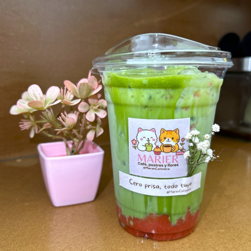 Matcha ceremonial japonés de Uji, Japón, servido con leche deslactosada, hielo y un toque de fresa natural. Una mezcla deliciosa y equilibrada entre lo herbal del matcha y la dulzura de la fruta.