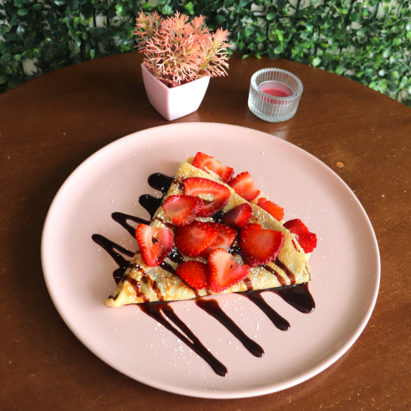 Delicada crepa rellena de Nutella y fresas frescas, una combinación clásica y deliciosa.