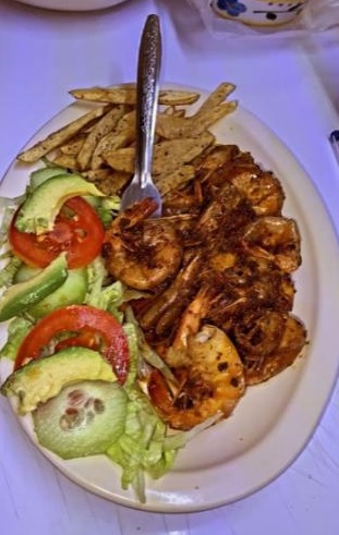 Camarón grande al mojo junto con su ensalada pepino, jitomate, lechuga, aderezo y papas fritas.