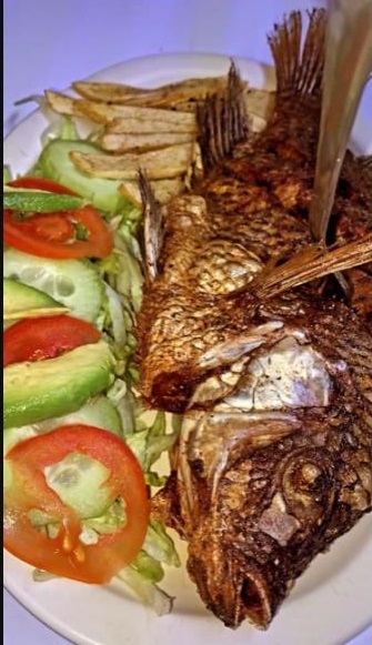 Filete capeado con ensalada, limón, pepino, jitomate y lechuga.
