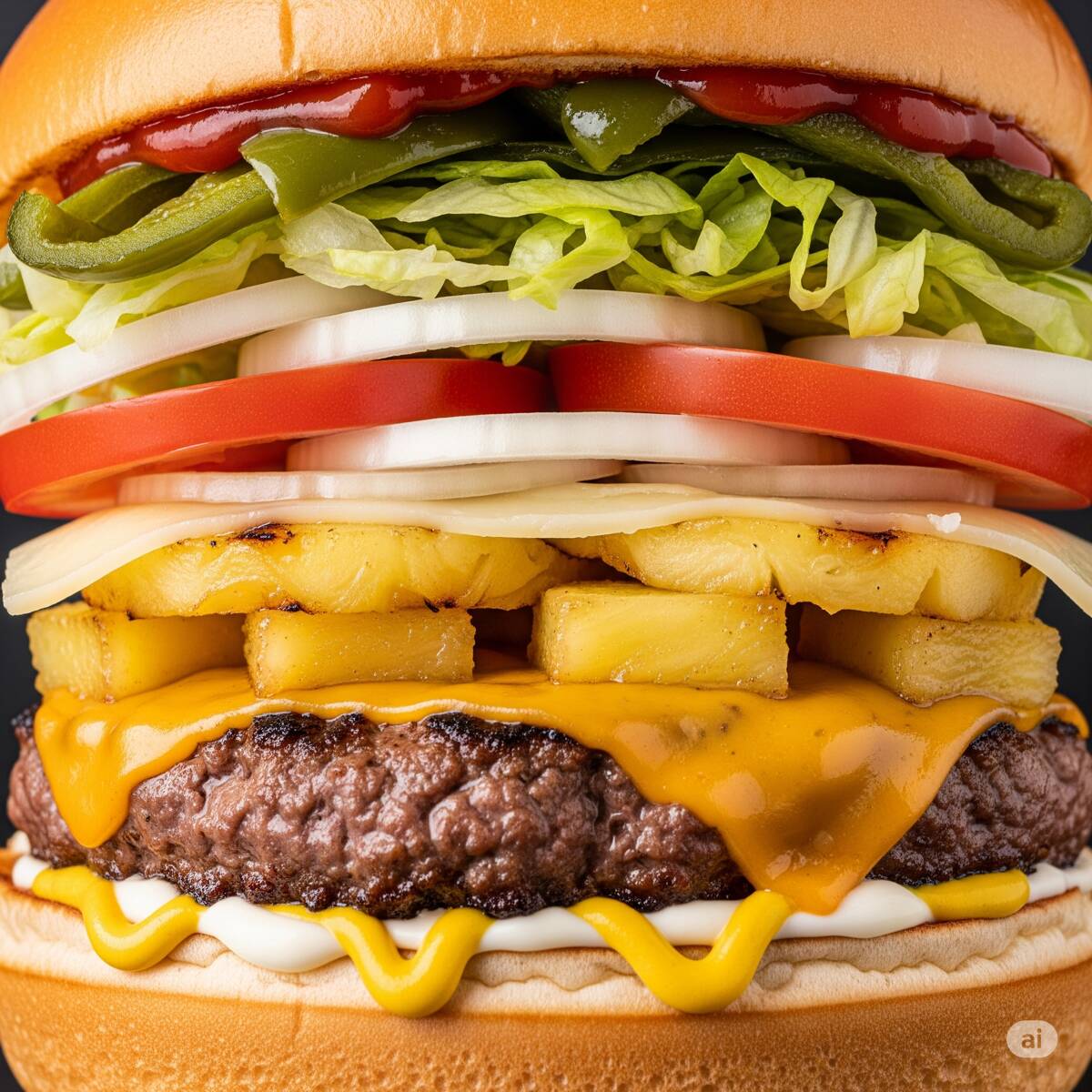 Carne, queso americano, lechuga, jitomate, cebolla, mayonesa, catsup, mostaza, Jalapeños, piña en trozos