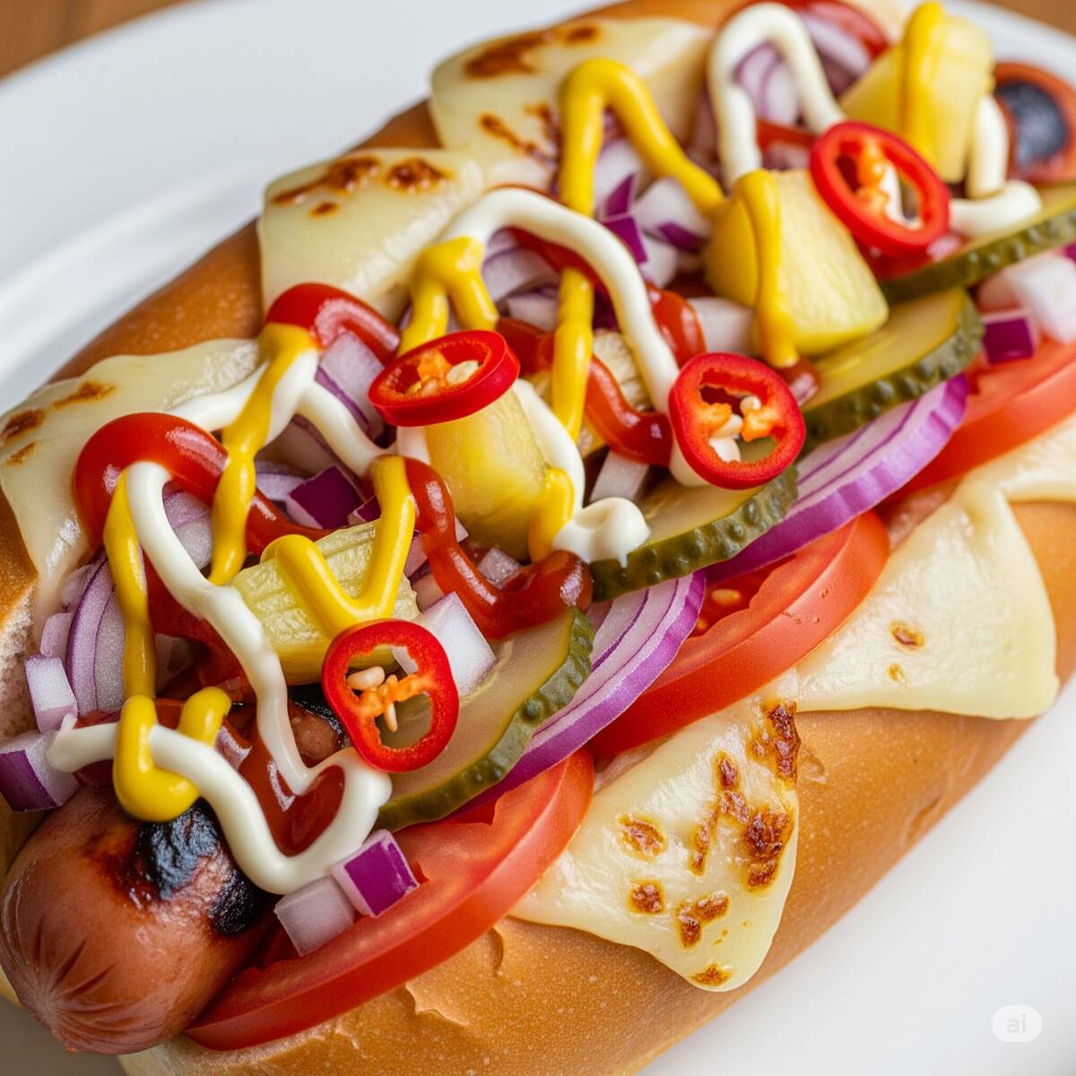Salchicha, tocino, cebolla, jitomate, rajas, pepinillos, catsup, mayonesa, mostaza