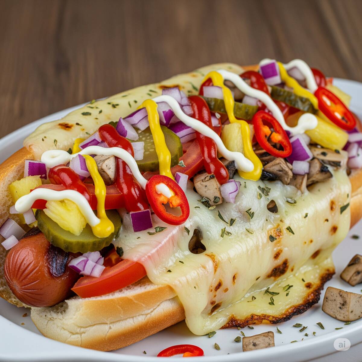Salchicha, tocino, piña en trozos, manchego, cebolla, jitomate, rajas, mayonesa, mostaza, catsup