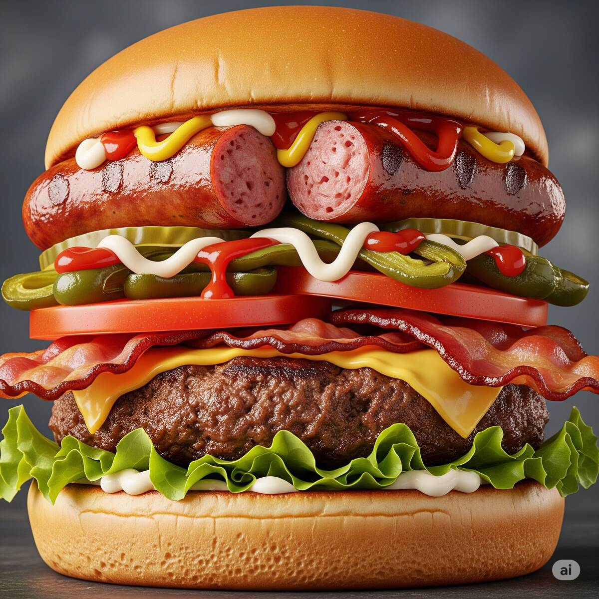 Carne, queso americano, chorizo oaxaca, queso mozarella, lechuga, jitomate, cebolla, pepinillos, rajas, catsup, mayonesa, mostaza