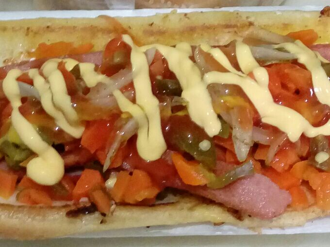 Pan grande, doble salchicha, tocino, queso líquido, zanahoria con picante, gotas de aderezo de habanero, queso manchego, cebolla caramelizada, piña en cubos, mayonesa, mostaza y catsup.