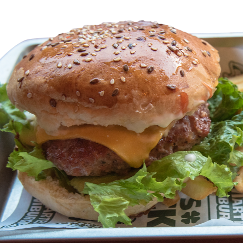 200 gr de carne de res, pan brioche, queso, tocino, jitomate y lechuga.