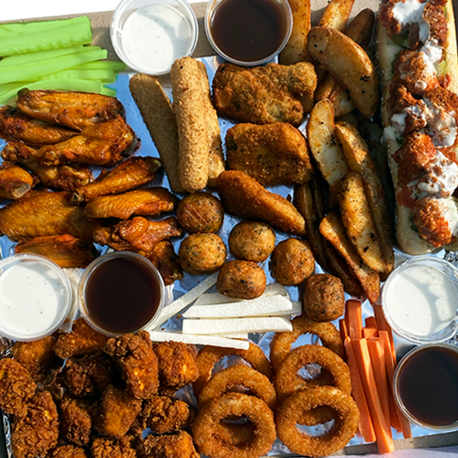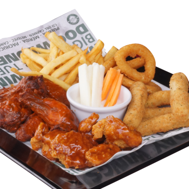 8 alitas, 8 boneless, 200 gr de papas gajo, 6 aros de cebolla, 4 jalapeños poppers, 2 hot dog jumbo y 4 salsas a elegir.