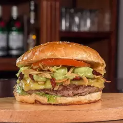 200 gr de carne de res, pan brioche, queso, tocino, jitomate y lechuga.