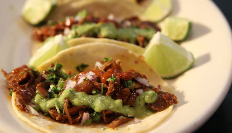 Tortilla de maíz, carne asada, cebolla, cilantro y guacamole.