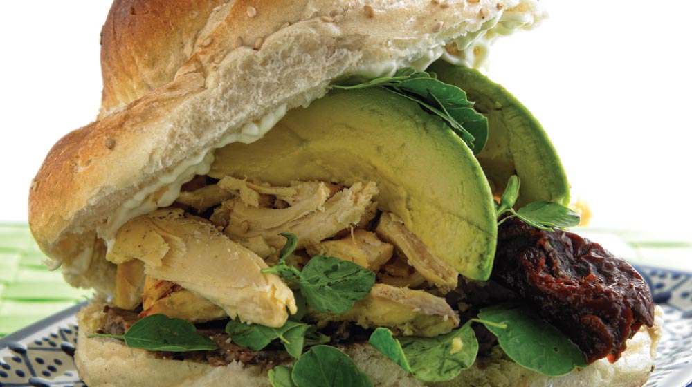 Pan de cemita, pollo asado, cebolla, cilantro y guacamole.