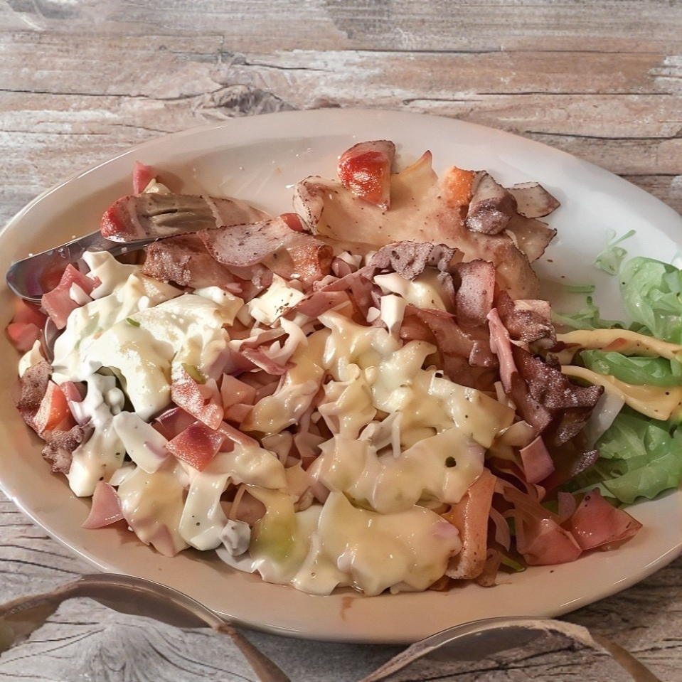 Carne de res, jitomate, cebolla, jamón, tocino.y queso gratinado, tortillas de maiz