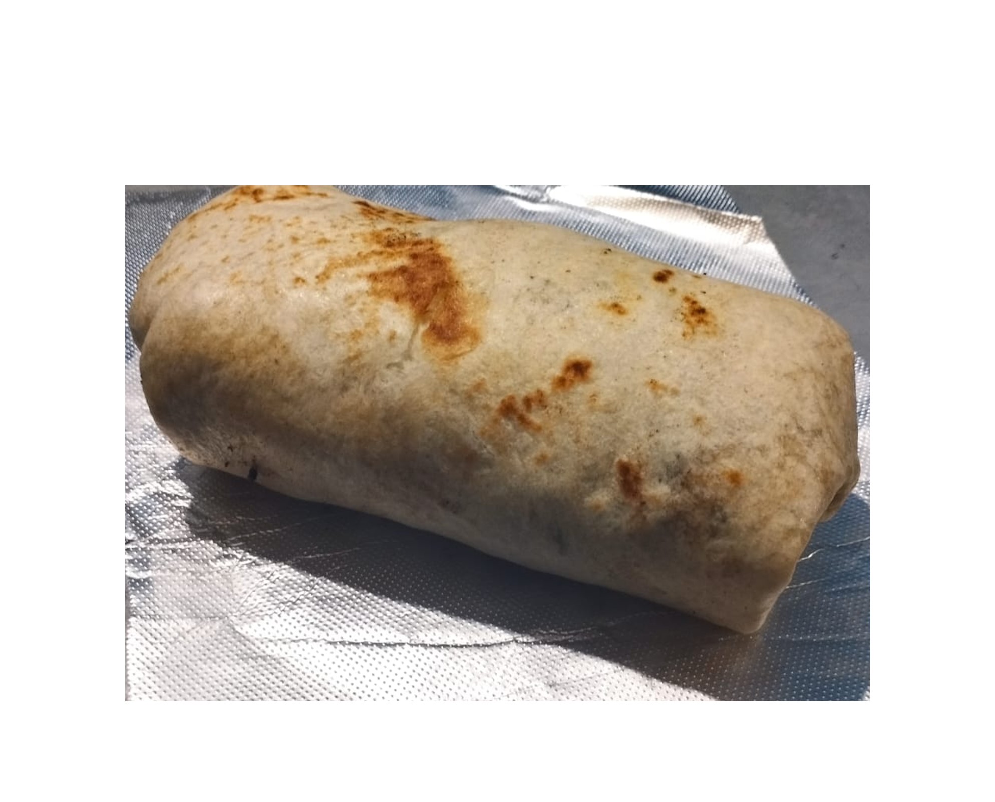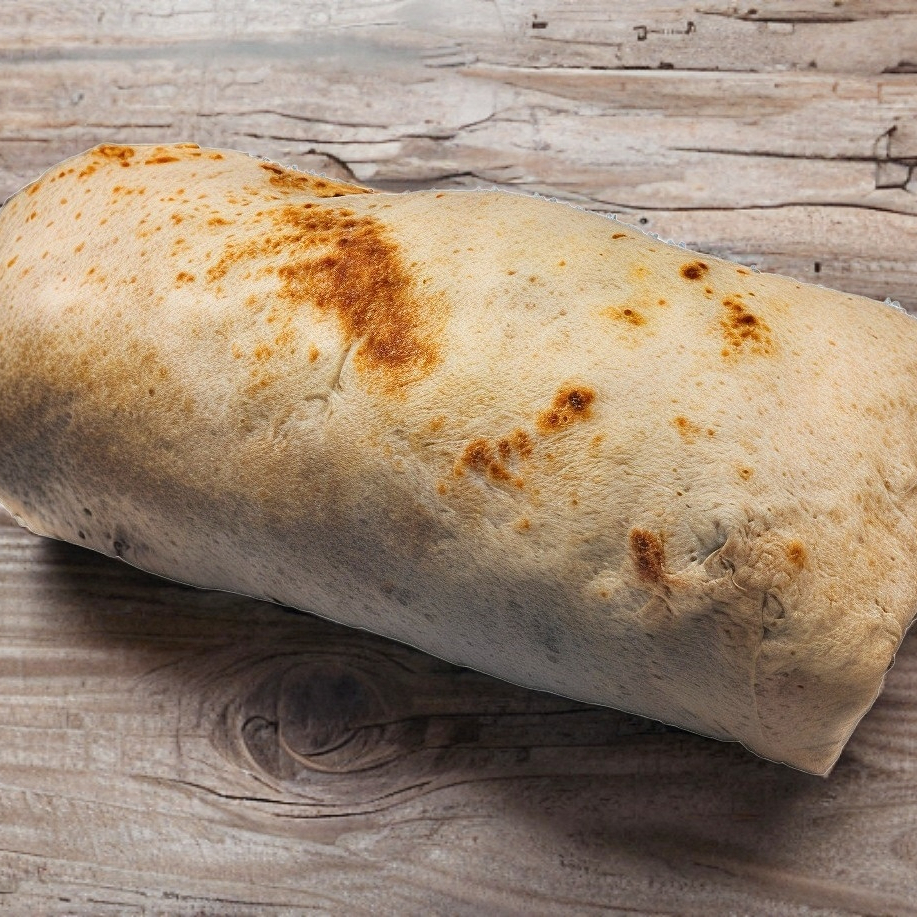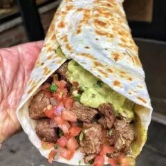 Tortilla de harina de 20 cm, va envuelta adentro lleva arroz, frijol, queso, cebolla, cilantro, guacamole y carne asada