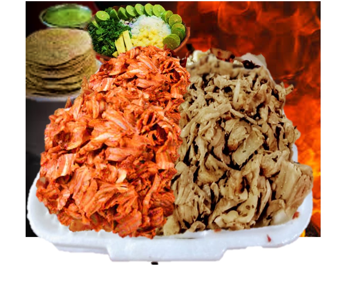 1/4 de Carne al Pastor, 1/4 de Carne Árabe - Incluye: Tortillas de pan árabe, de maíz, de harina, cilantro, limones, salsa verde, salsa roja