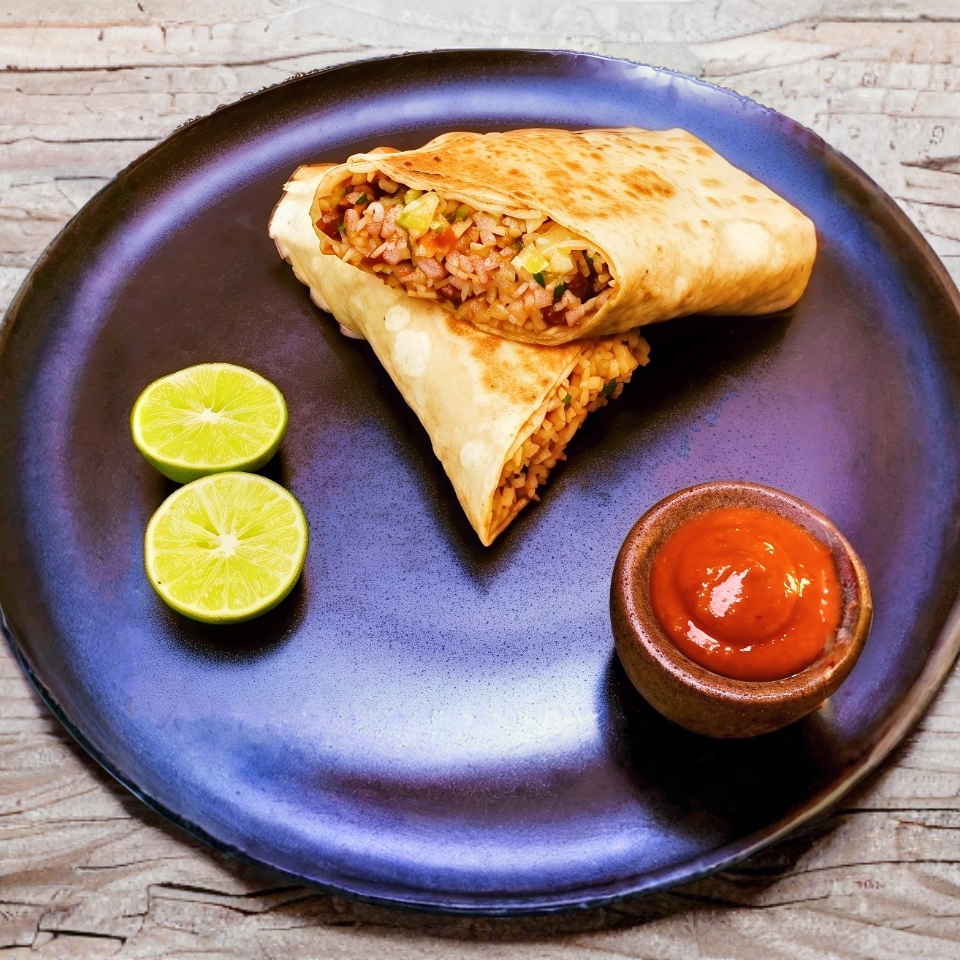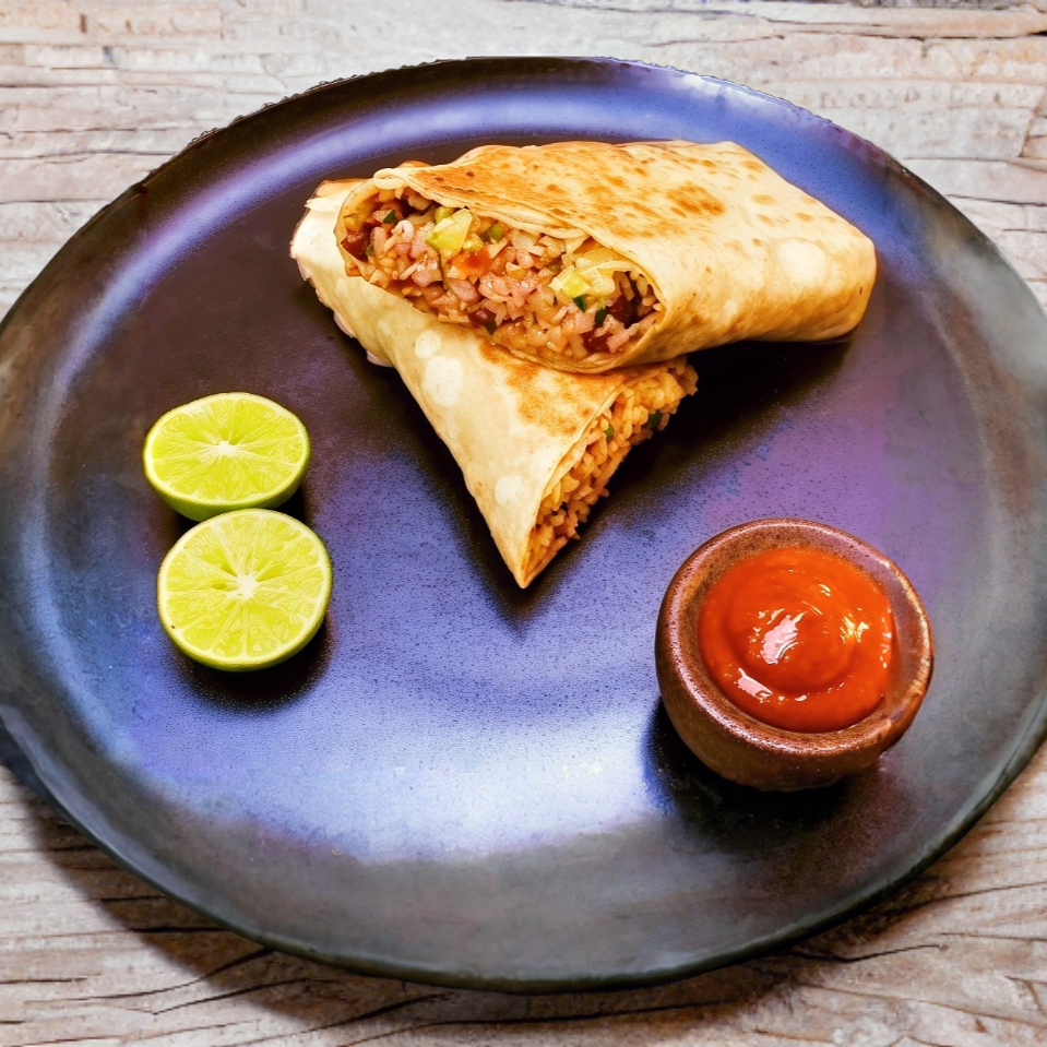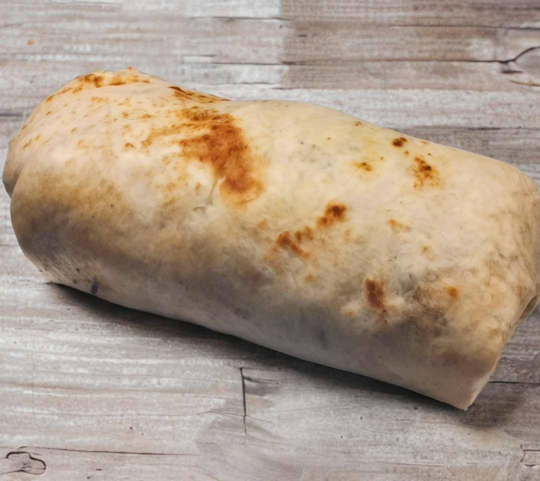 Tortilla de harina: Arroz blanco, frijol, queso manchego, cebolla, cilantro, guacamole y carne a elección.
