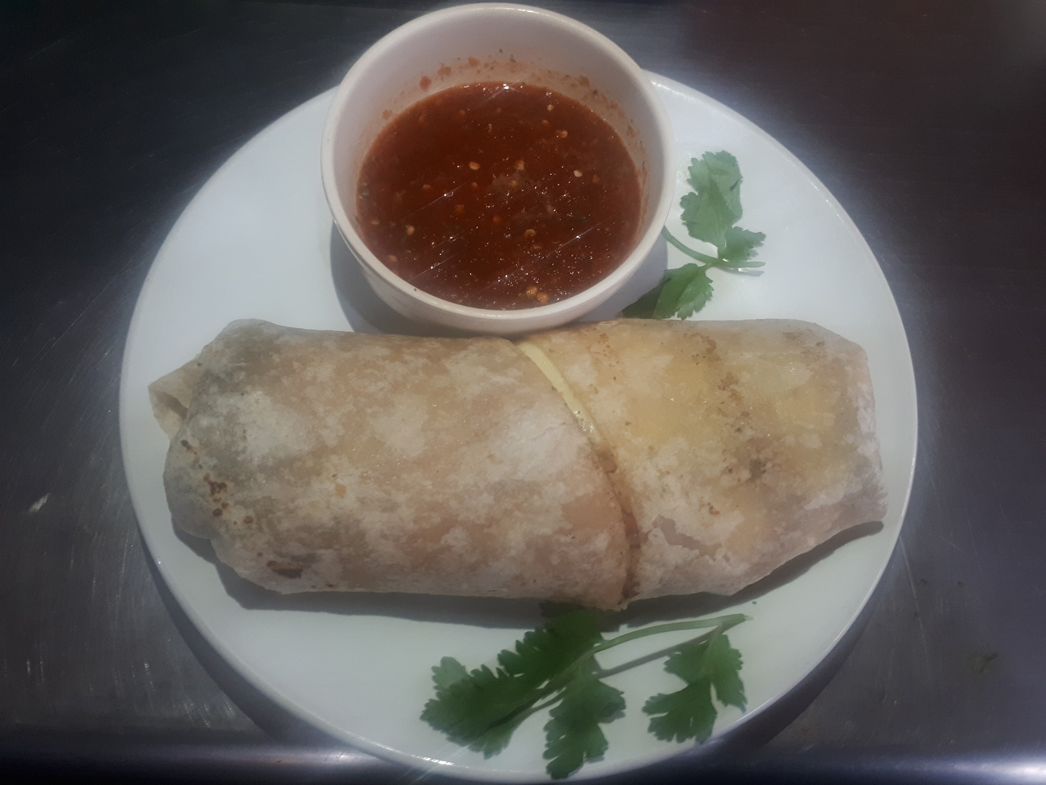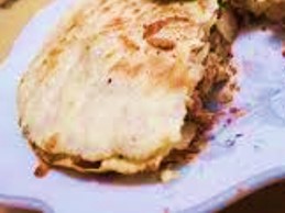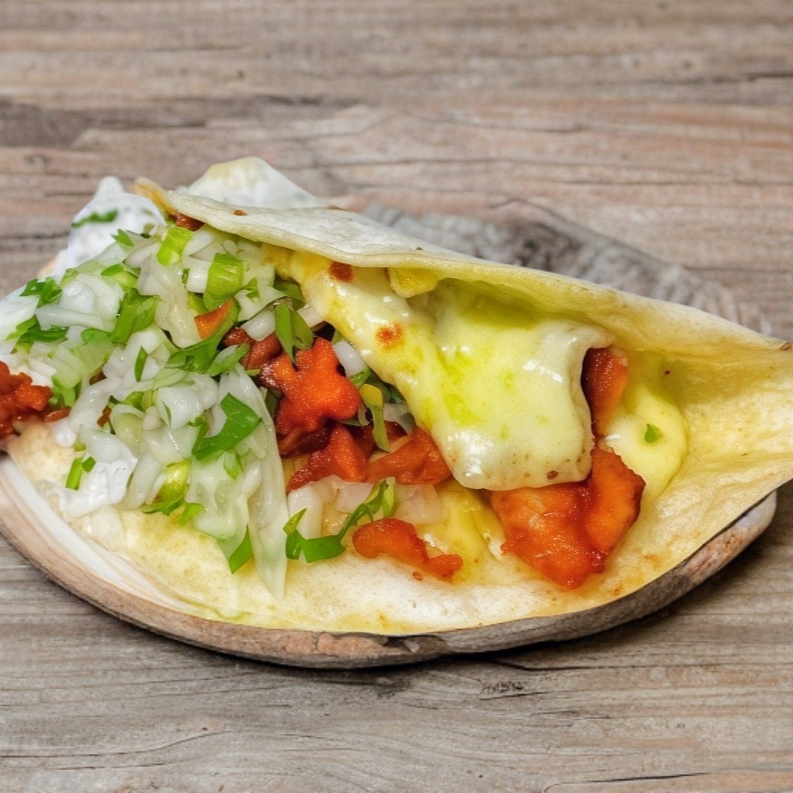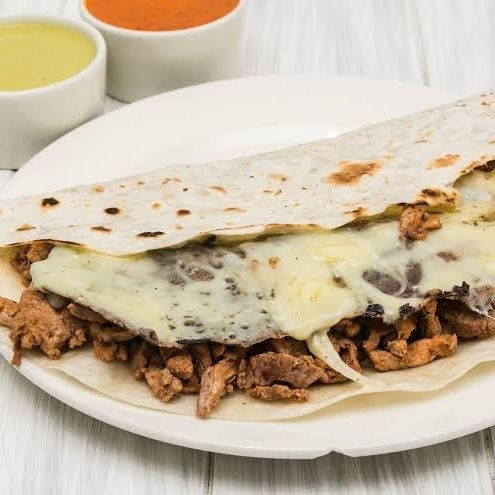 Tortilla de Pan árabe, queso, cebolla, cilantro y carne.