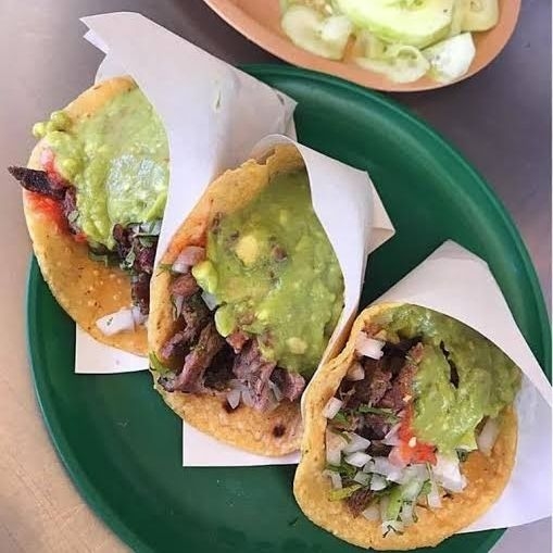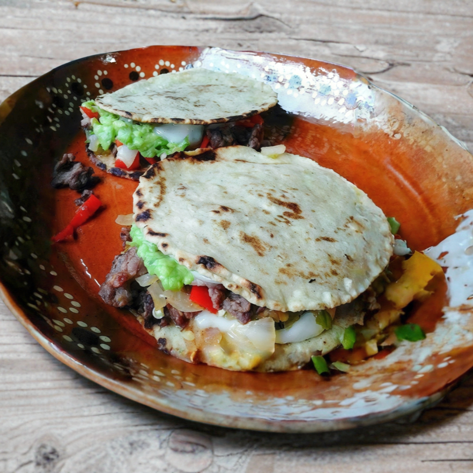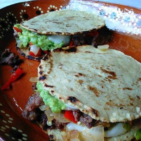 Dos Tortillas de harina, Carne, cebolla, cilantro y aguacate.