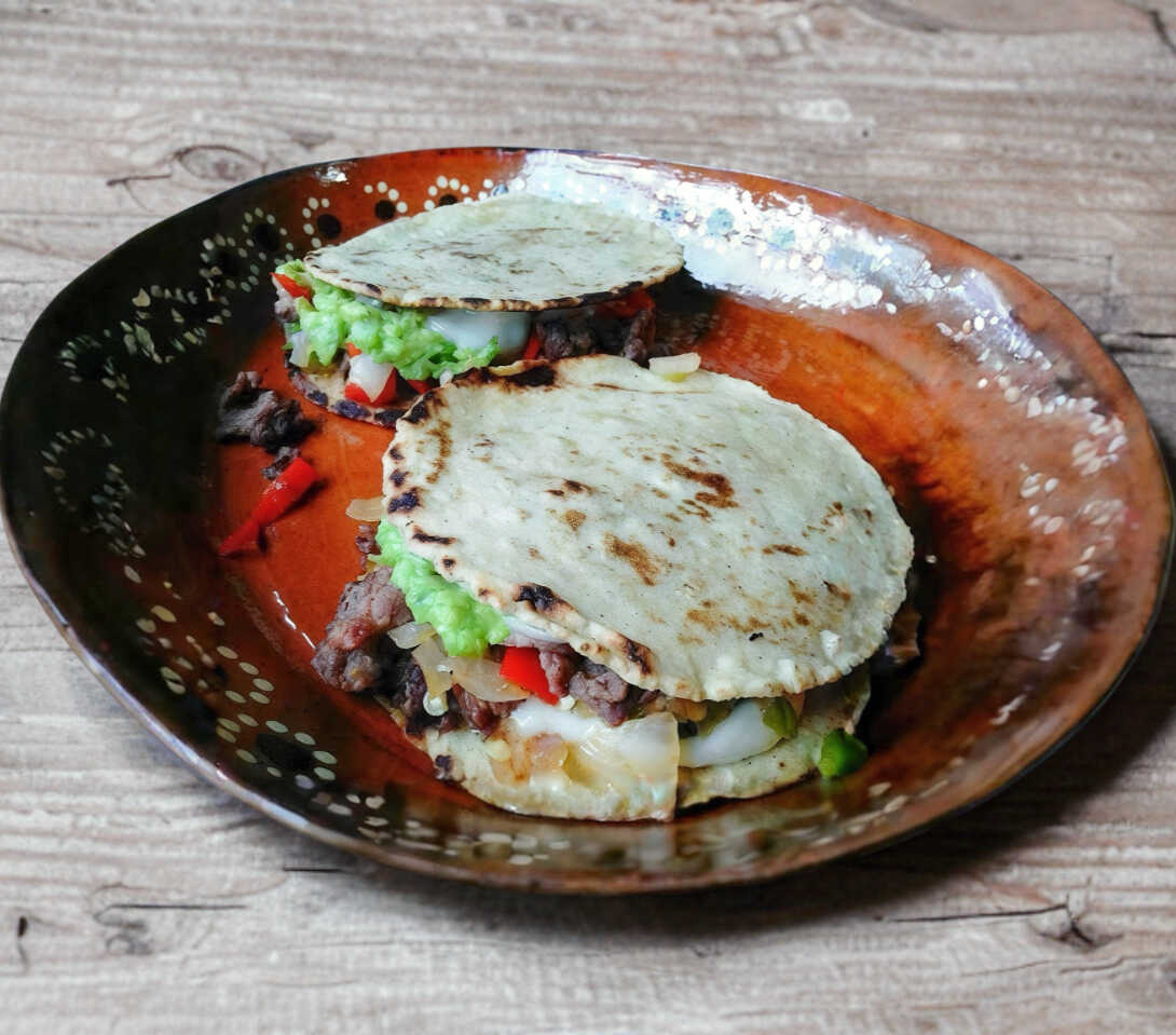 Dos tortillas de maíz, queso, cilantro, guacamole y carne arabe